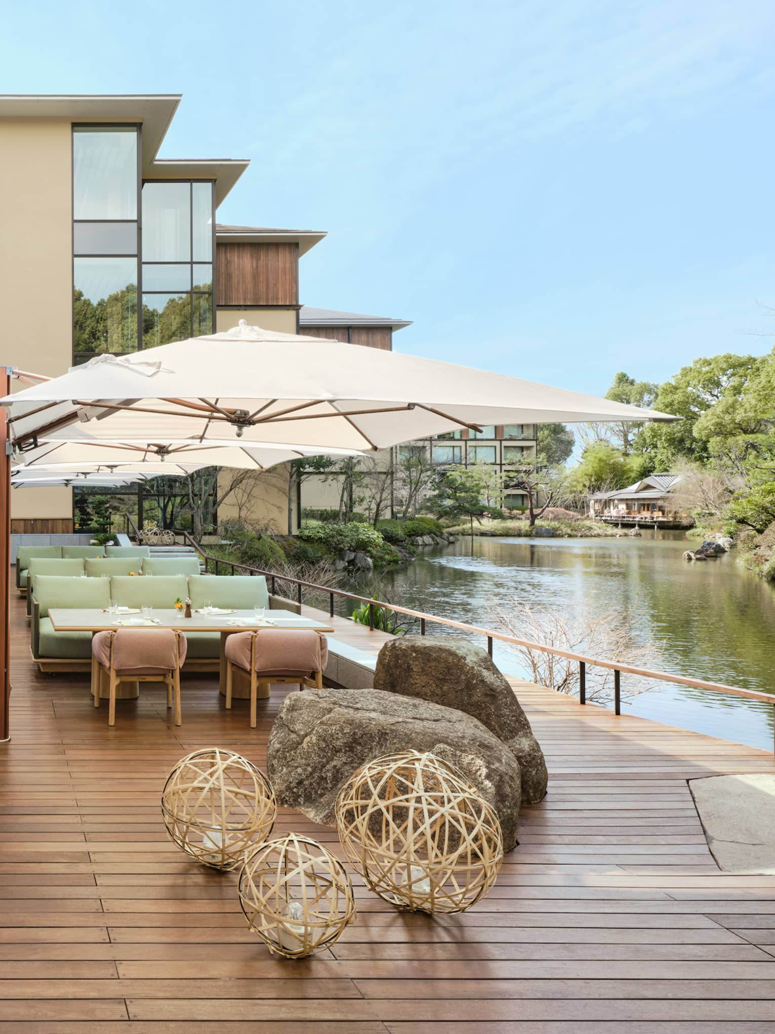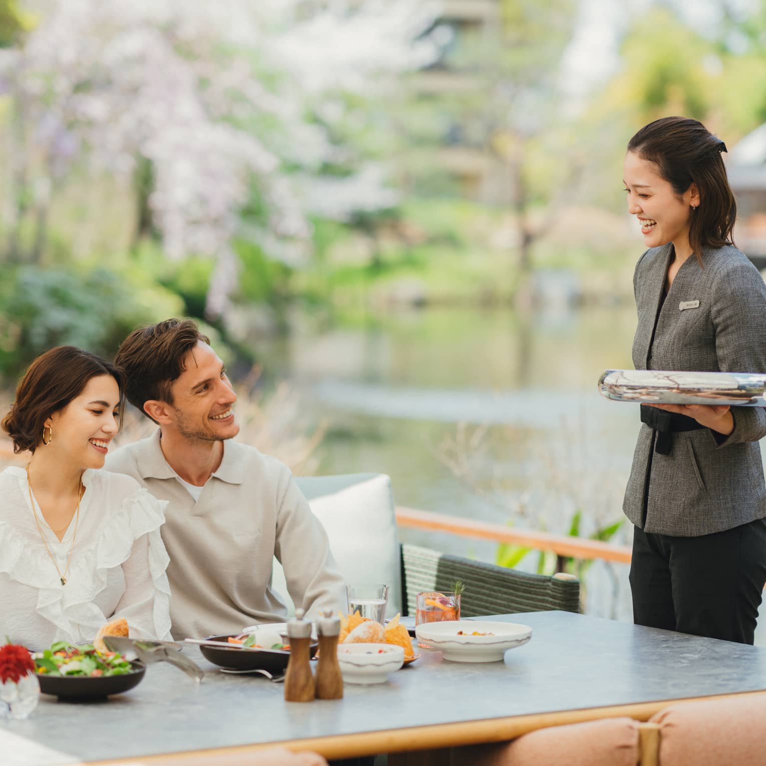 エンバ・キョウト グリルのテラス席では、池泉庭園を望む開放的な空間で、心地よい季節の空気を感じながらお食事をお愉しみいただけます。自然に包まれるひとときが、ゴールデンウィークの京都滞在をより印象深く彩ります。