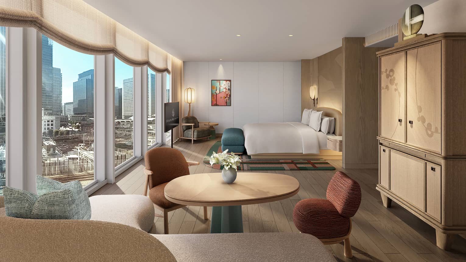 スタイリッシュで広々したコーナースタジオ。窓から自然光が降り注ぎ、東京を象徴する眺望をお楽しみいただけます。ワーキングデスクをご用意し、お仕事にもリラックスタイムにも最適なアーバンオアシスです。