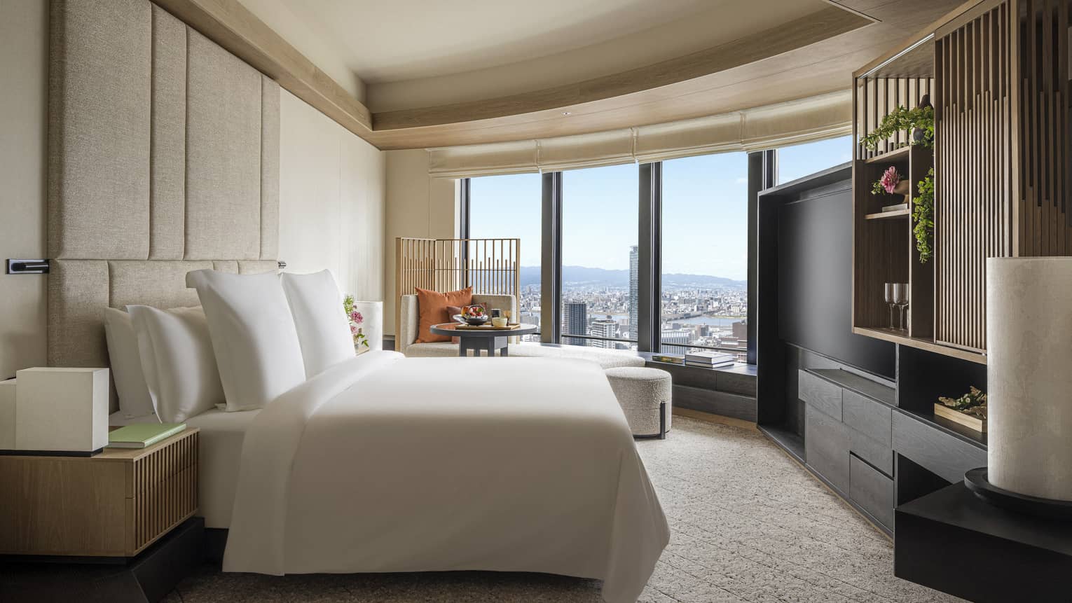 淀川や賑やかな街並みなど、大阪らしい眺望を楽しめるコーナールーム。一面に広がる大きな窓から、エネルギッシュな大阪の街並みと、時間とともに移りゆく空の色のグラデーションをお楽しみください。