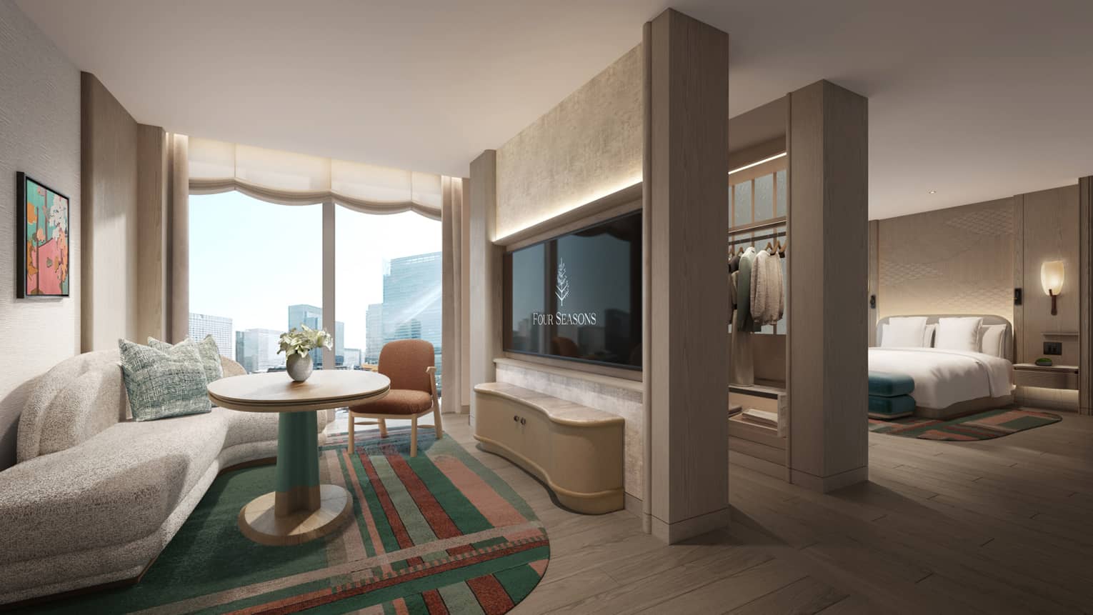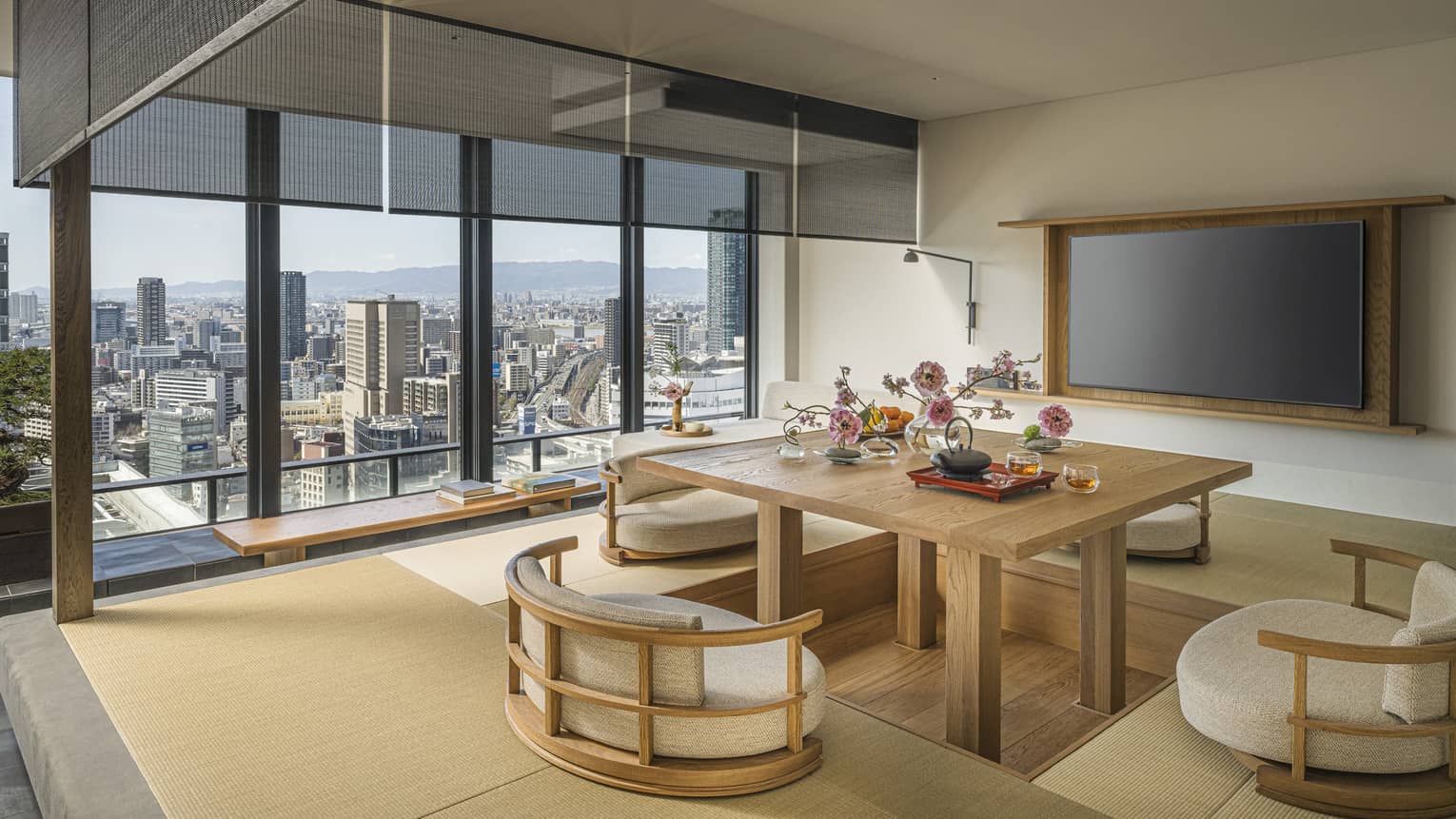 靴をぬいで玄関を上がると、フォーシーズンズホテル大阪だけの特別コンセプトフロア「GENSUI(玄水)」ならではのユニークな旅館体験が始まります。本フロアで最も広い「グランド畳スイート」には、高層階からの見晴らしの良い眺望、4人がけの掘りごたつ式ダイニングテーブルや、引き戸で仕切られた畳敷きのベッドルームが備わります。快適な睡眠にこだわったフォーシーズンズオリジナルの布団仕様の贅沢で柔らかなマットレスもぜひご堪能ください。