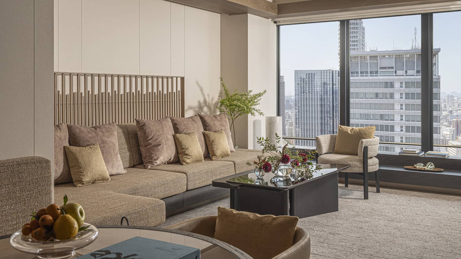 一方には緑豊かな皇居の杜、もう一方には高層ビル群を見渡す贅沢なコーナースイート。広々としたリビングルームで団欒のひとときに過ごした後は、静かなベッドルームでゆっくりとおやすみください。このスイートは2ベッドルームスイートとしてもご利用いただけます。詳細はホテルまでお問い合わせください。