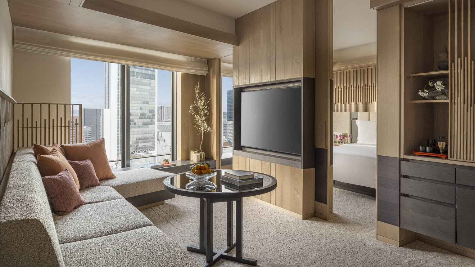 和のエッセンスを取り入れたデザインのリビングエリアは、都会の街並みとともに思い思いにくつろげる落ち着いた空間です。まるでスパのように広々としたバスルームには、深めのバスタブをご用意。1日の疲れを癒すバスタイムをお楽しみいただけます。