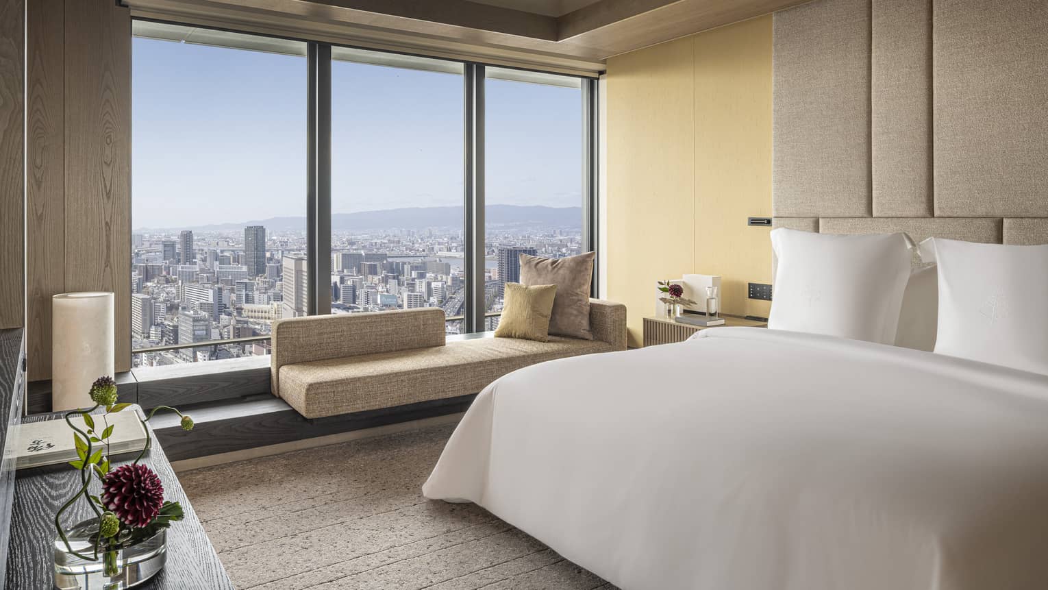 和のエッセンスを取り入れたデザインのリビングエリアは、都会の街並みとともに思い思いにくつろげる落ち着いた空間です。まるでスパのように広々としたバスルームには、深めのバスタブをご用意。1日の疲れを癒すバスタイムをお楽しみいただけます。