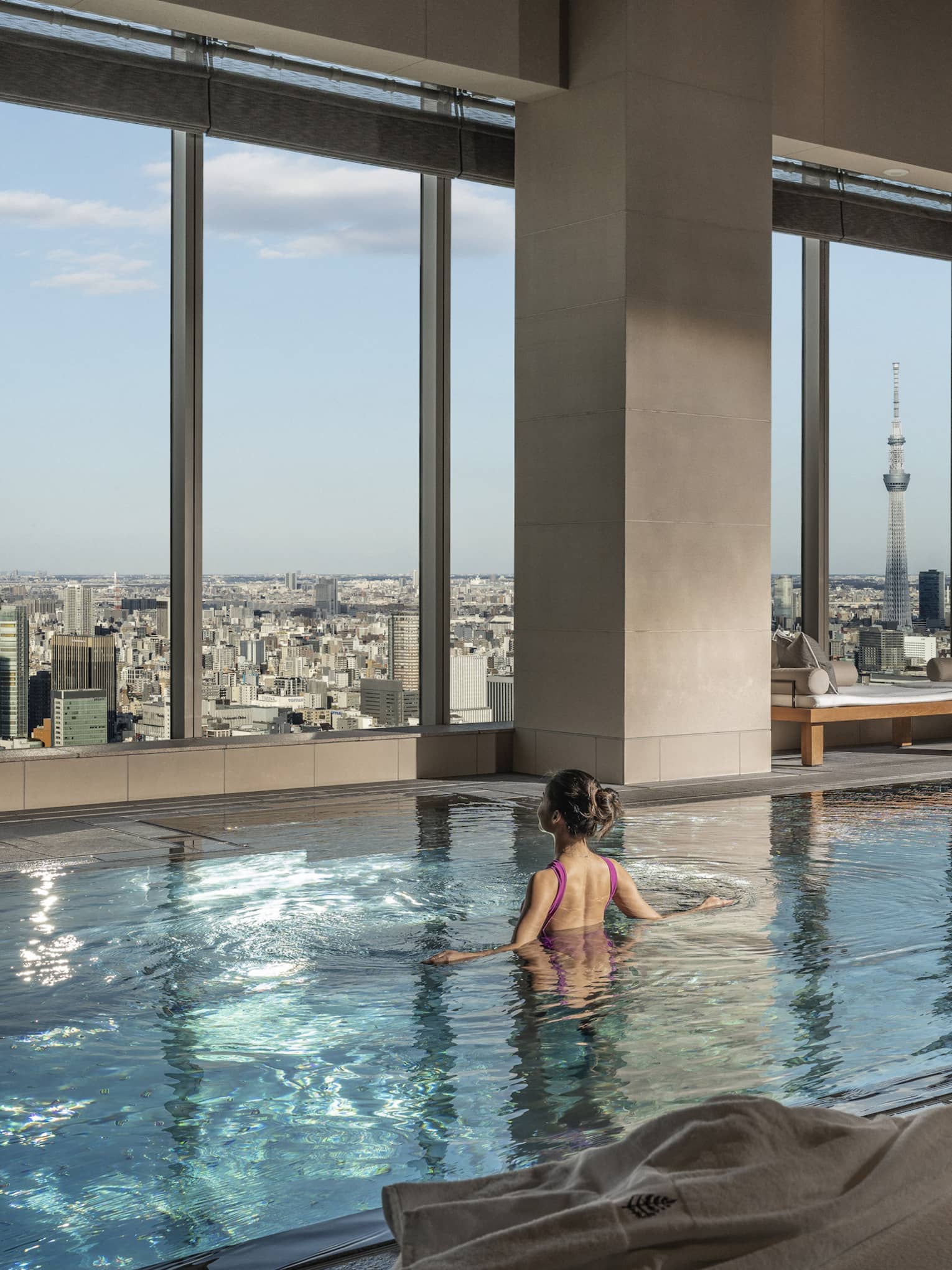 自然光が注ぎ込むプールエリアは、都心の絶景を望みます。プールでひと泳ぎの合間には、爽やかなミストを浴びながらおくつろぎいただけるミストチェアやハイドロマッサージ機能付きバイタリティプールでリラックスいただけます。
