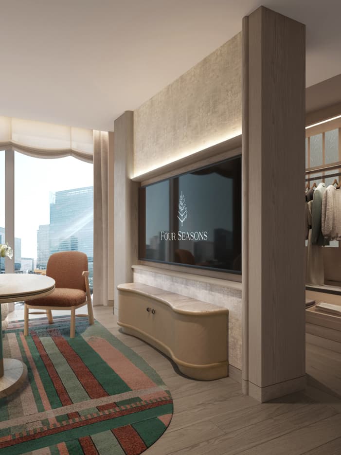 一方には丸の内の高層ビル群、もう一方には赤煉瓦の東京駅舎を見渡す贅沢なスイート。和の感性を取り入れたモダンなインテリアの広々としたリビングルームで、くつろぎのひとときを。