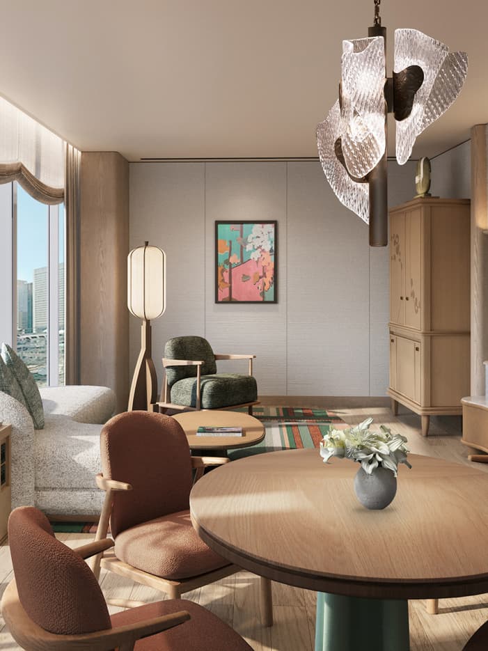 リビングルームとベッドルームを独立させた間取りの1ベッドルームスイート。バスルームには床から天井までの窓を設え、バスタブから外を眺めながら都心の景色をお愉しみいただけます。