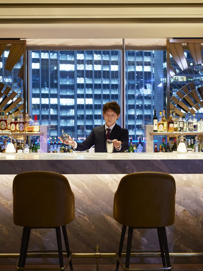 バー&シャンパンラウンジは、スタイリッシュでくつろげる空間です。バーチームによる独創的なカクテルや洗練されたクラシックカクテルを、そしてソムリエが監修したグラスシャンパンをご用意しています。また、一流フレンチシェフの料理もお楽しみいただけます。