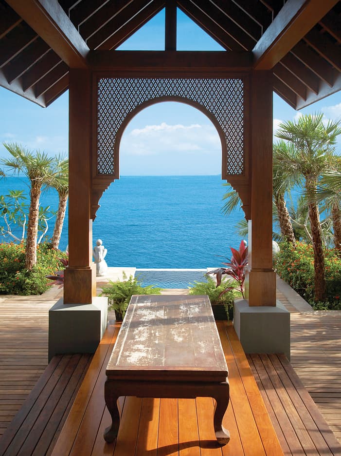Contemporary southern Thai–style interiors. Tropical rosewood furnishings highlight custom-made artwork.