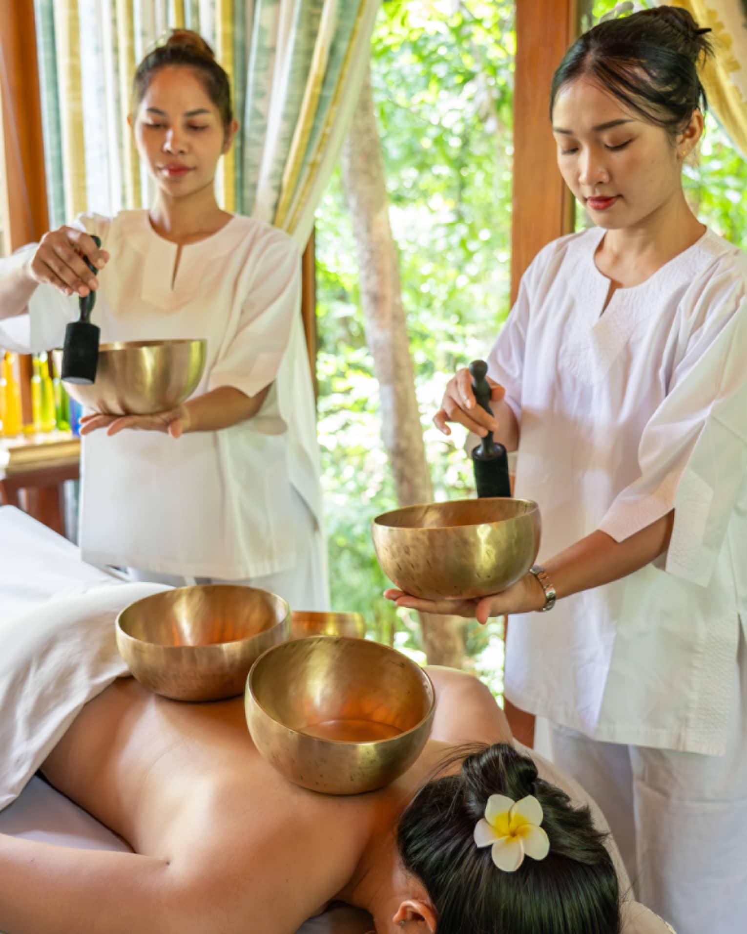 Immerse yourself in a healing journey as Tibetan singing bowls awaken the senses, followed by a four-hands massage in wave-like harmony. A crystal massage restores balance, before a singing bowl bath with jasmine blossoms envelops you in serenity. This ritual ends with Thai Buddhist chanting for profound peace.
