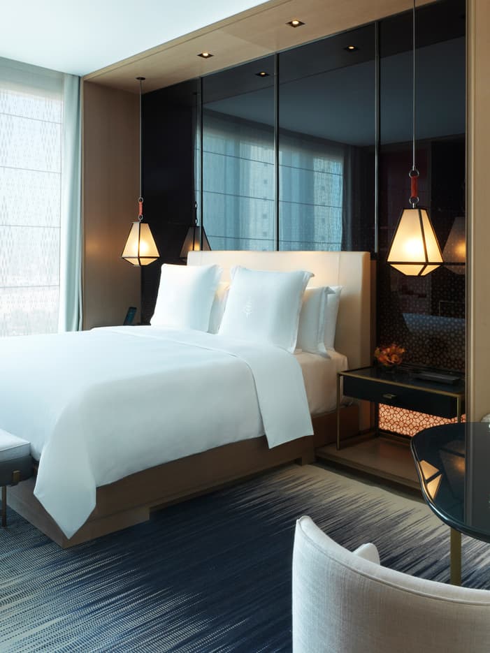 With pool views and city vistas from the fifth to nineteenth floors – stretching to the Gulf in the distance – these serene havens of design include a sitting area and large marble bathroom with a free-standing tub and in-mirror TV. Connecting and twin bed options are also available.