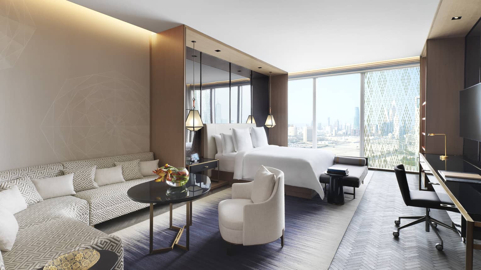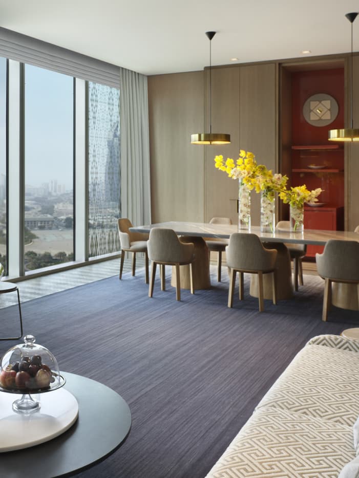 Flashes of burnt orange echo a Gulf sunset while soft shades of indigo recall starry desert skies in our Amiri Suite, which combines glittering city skyline views with artful design touches beneath soaring 3.5-metre (11.5-foot) ceilings.