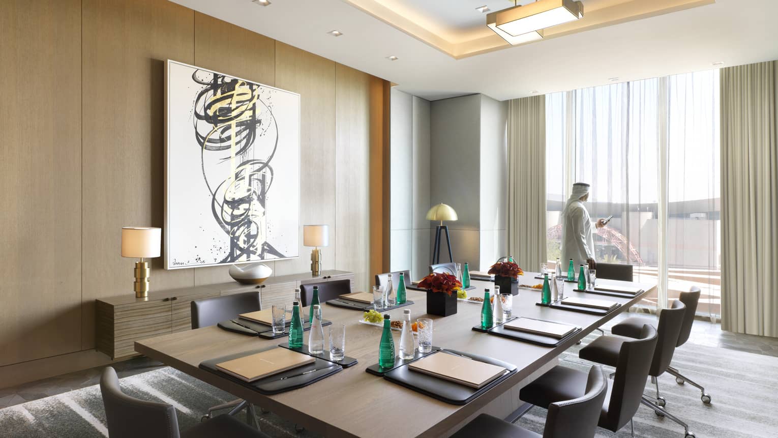 Executive SuiteAn artful juxtaposition of Kuwait’s business heart with restful escapism, this suite features a millwork-lined foyer leading to a spacious living room with sleek, curved furnishings and divider doors for master bedroom privacy.