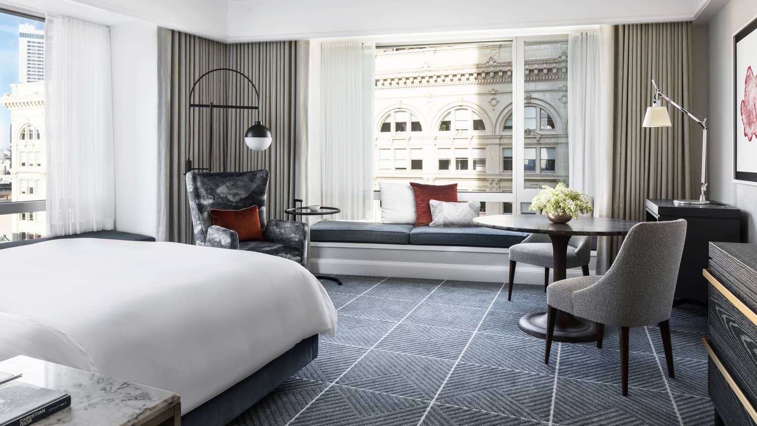 Newly renovated accommodations feature floor-to-ceiling windows with views of the surrounding city.