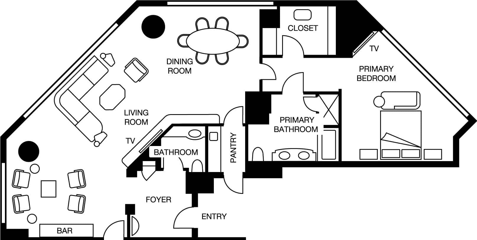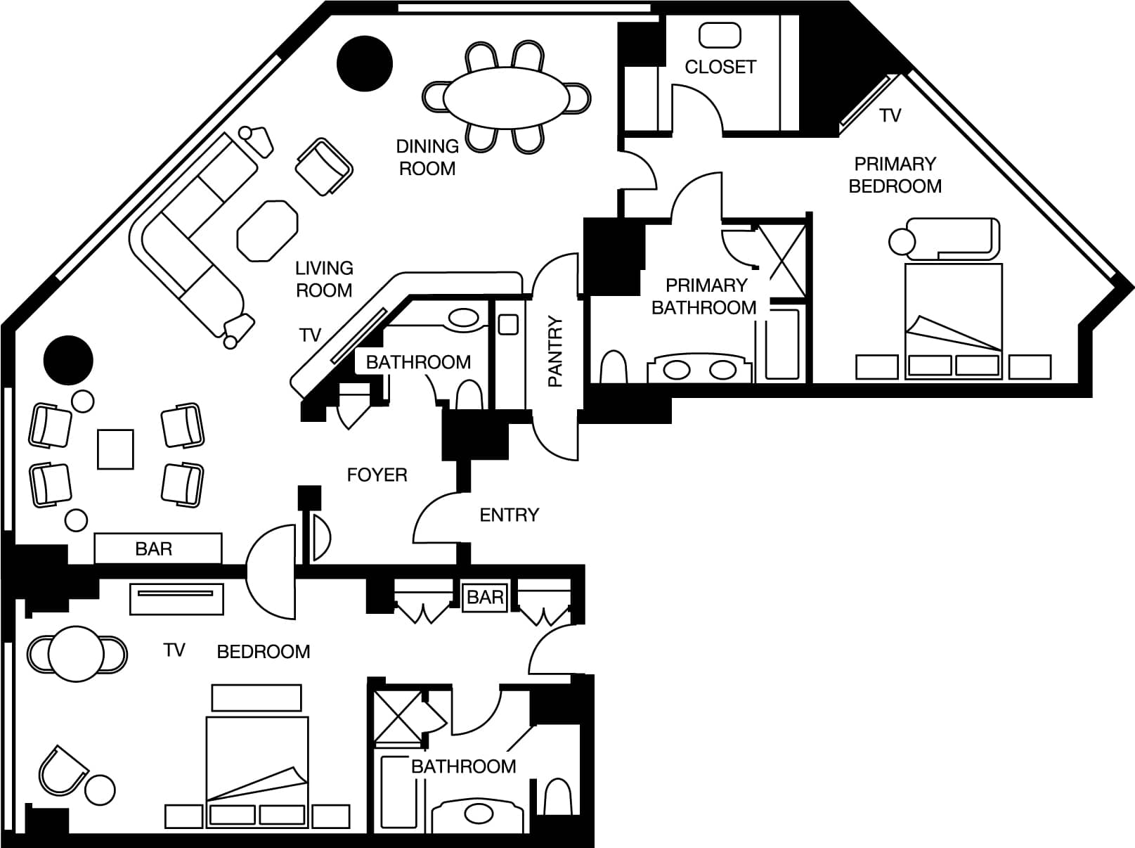 One king bed, One sofabed, one rollaway and one crib (additional fee applies for the rollaways), or two rollaways and one crib