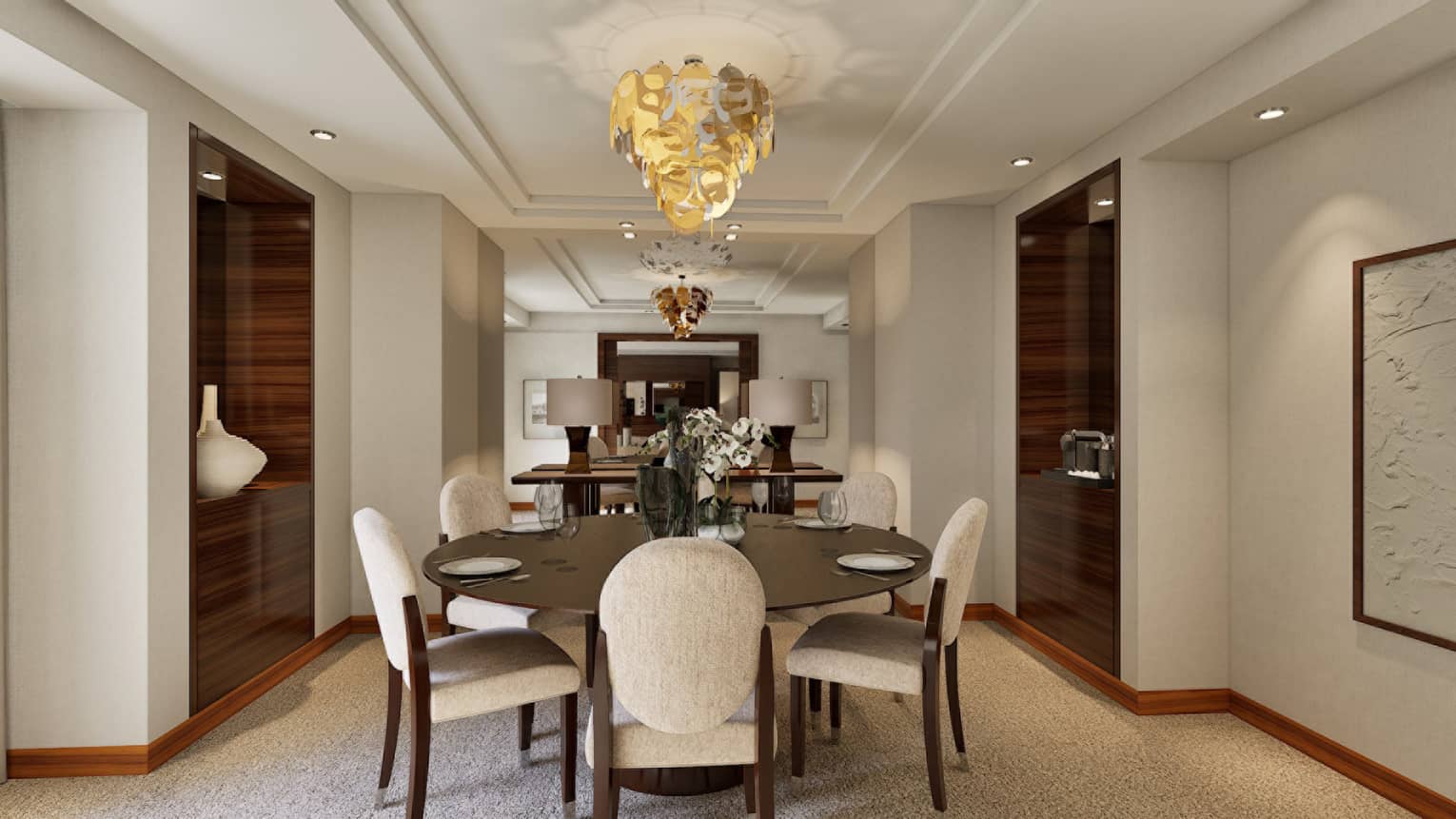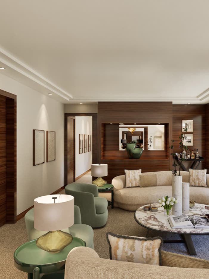 Enjoy sweeping views of Park Lane and Hyde Park from our elegant and inviting fifth-floor Presidential Suite in London. This luxurious suite features unique touches such as beautiful rosewood panelling, a private fireplace, and lounge seating for a relaxing experience. With dining space for six, it is perfect for families or friends travelling together.