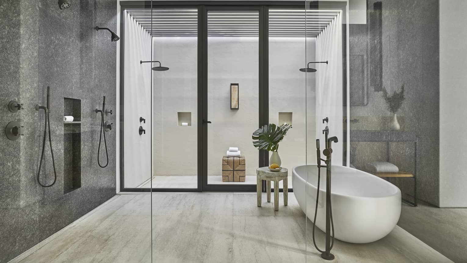 - Three sunlit bathrooms, each with sliding glass wall to the terrace, two vanity sinks, oversized shower and free-standing tub