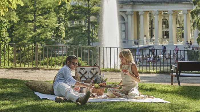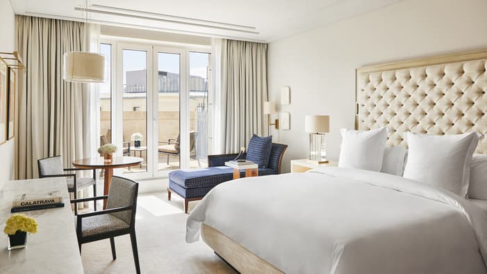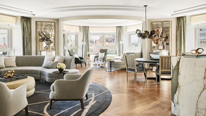With an expansive terrace that’s furnished for outdoor living and dining, this bright, airy suite feels like a chic apartment in Madrid’s best location. Entertain friends or business colleagues in the living room, separated from the bedroom for extra privacy.