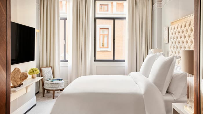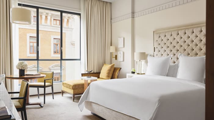Feel fully connected to the capital in these spacious guest rooms overlooking Calle de Alcalá or Calle de Sevilla. The boutique-style wardrobe creates a private dressing room beside the marble bathroom.
