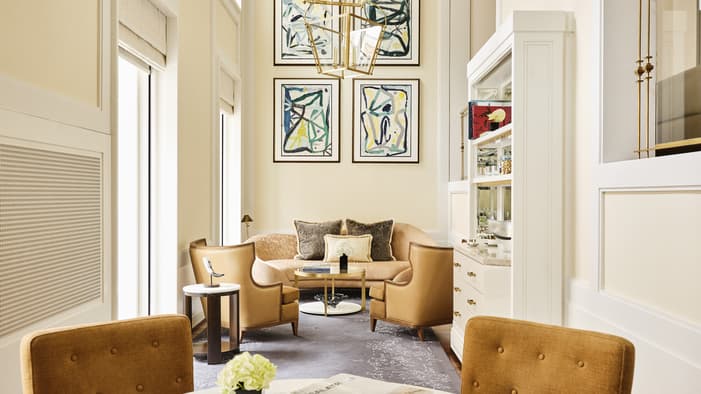 With a fifth-floor setting at the building’s triangular point, this prestigious suite is designed for glamorous socializing. The style is youthful and dynamic, mixing antiquities with modern furnishings. The deluxe primary bedroom includes its own sitting area, dressing room and a light-filled bathroom with a free-standing oval tub.