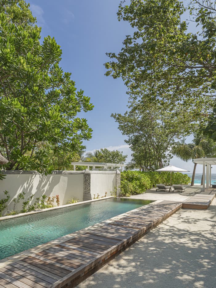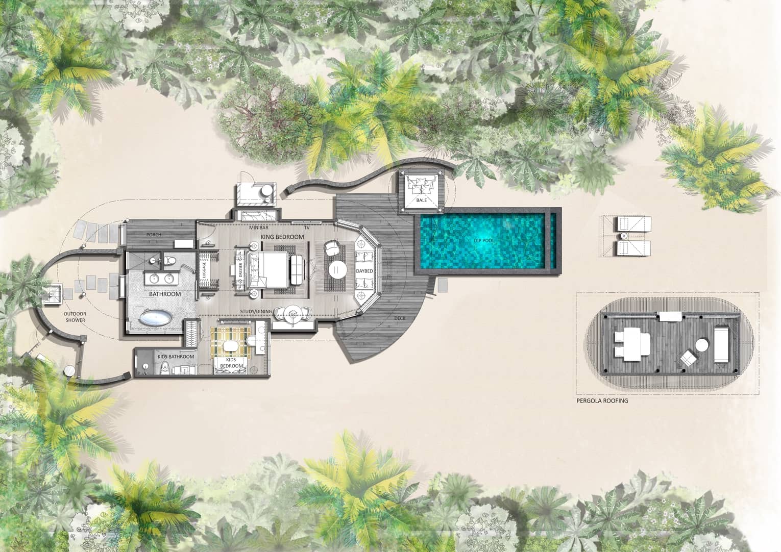 A luxurious haven for families, the Family Beach Villa with Pool features a spacious, light-filled ensuite bedroom and a separate kids’ bedroom complete with its own bathroom. Outside, a generous pool deck surrounded by tropical greenery leads down a sandy path to the crystal lagoon. Positioned for sunset views, the villa makes family evenings even more magical.