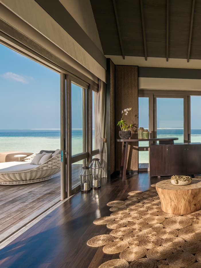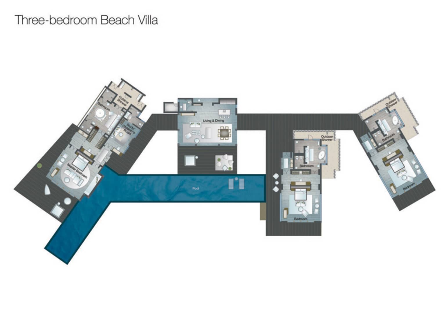 Just steps from the powdery sand, with vast beach-chic interiors radiating effortless style, this villa boasts a massive sunbathing pool, an al-fresco living room and a Master Suite with ocean views on three sides. The Master Suite has an attached study (also used as a children’s room), while the two additional bedrooms are each housed in their own separate pavilion. Enjoy en-suite bathrooms including three outdoor garden showers.