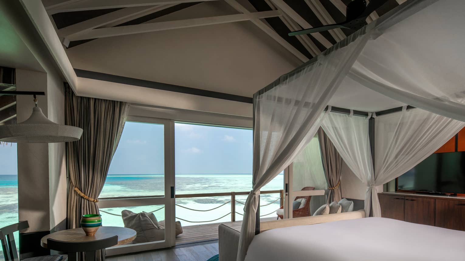 Indoor-Outdoor LivingThe air-conditioned living room opens onto an al-fresco living deck with a a 17-metre-long (56-foot-long) sunset pool, a dining table, loungers, hammocks and steps that lead you down into some of the atoll’s clearest waters.