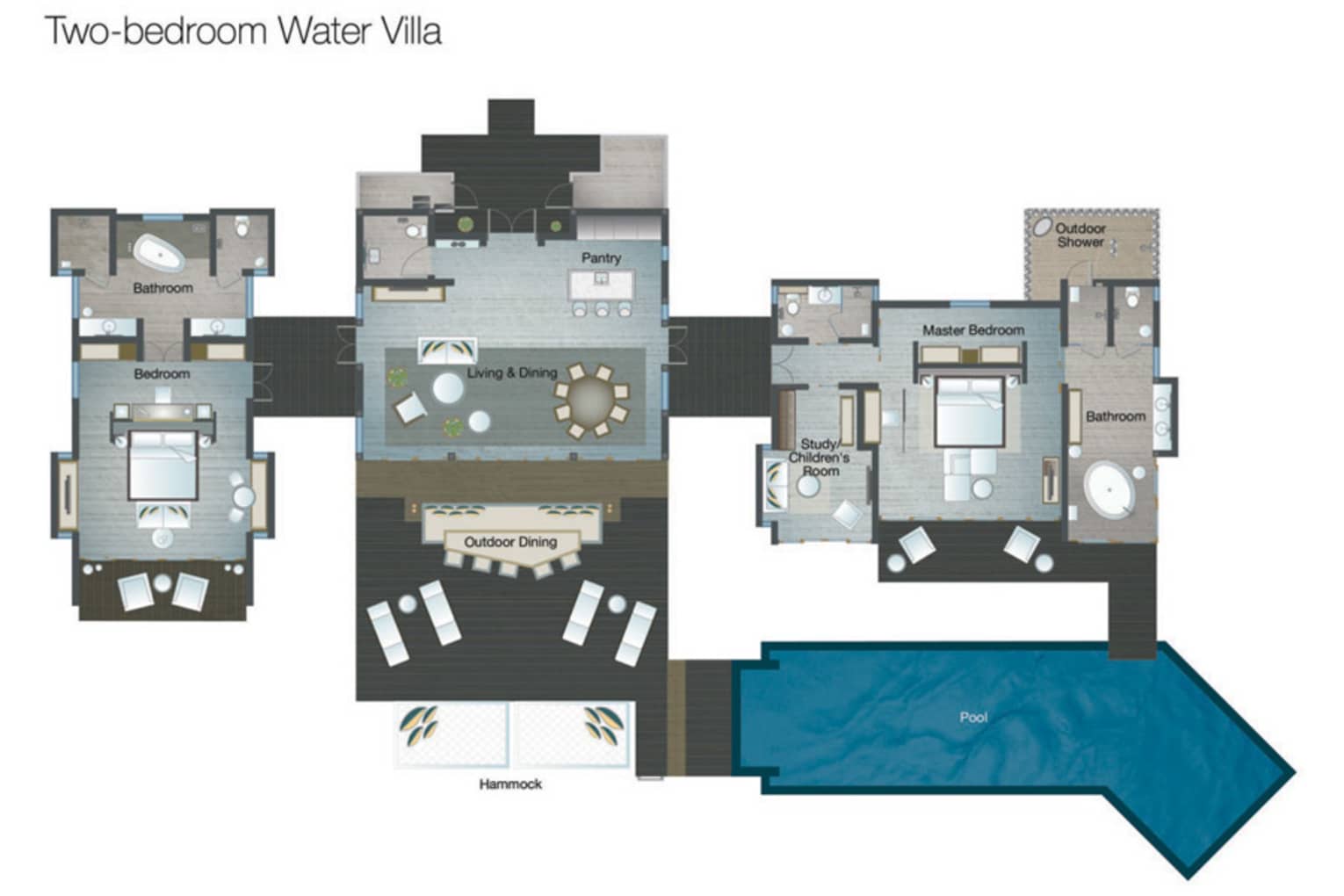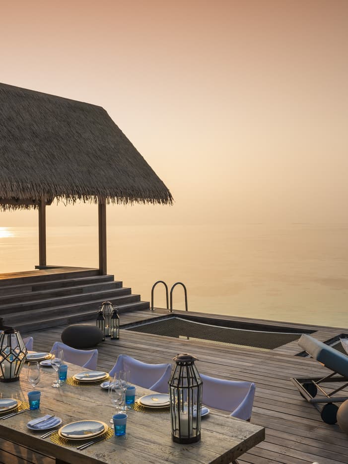 Stilted above the fish-filled lagoon, this two-bedroom villa features a master bedroom with an attached study or children’s room, as well as a separate, king-size bedroom pavilion. Relax in the air-conditioned living room, on the al fresco deck with a 17-metre (56-foot) sunset-view pool, or on a lounge chair or hammock. Steps lead down into some of the atoll’s clearest waters for snorkelling, turtle safaris or simply floating above the kaleidoscopic reef life.