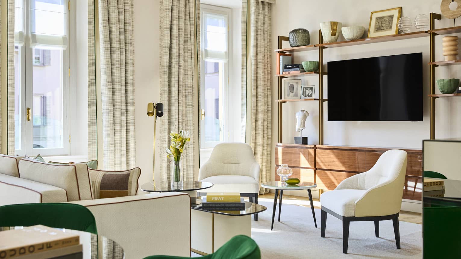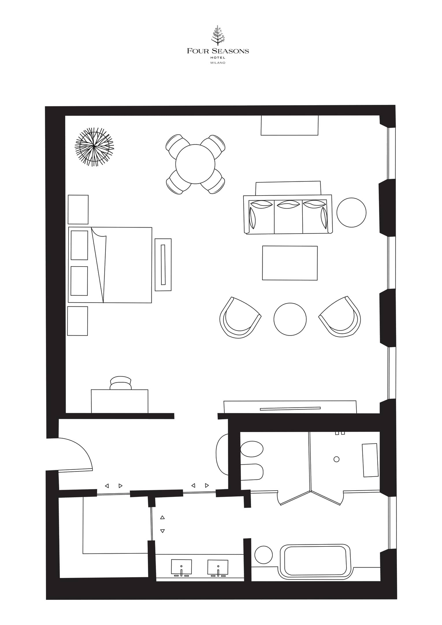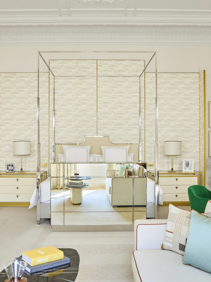 Characterized by a ceiling with original Renaissance stucco, our Renaissance Suite has been completely reimagined by celebrated designer Pierre-Yves Rochon. The living room overlooking the Hotel’s garden is the perfect setting in which to relax after a busy day in Milan. The vibrant colour palette creates a welcoming atmosphere, and modern furnishings blend harmoniously with classic elements. Unwind on the comfortable sofas, enjoy an intimate dinner at the dining table or retreat to the large canopy bed.