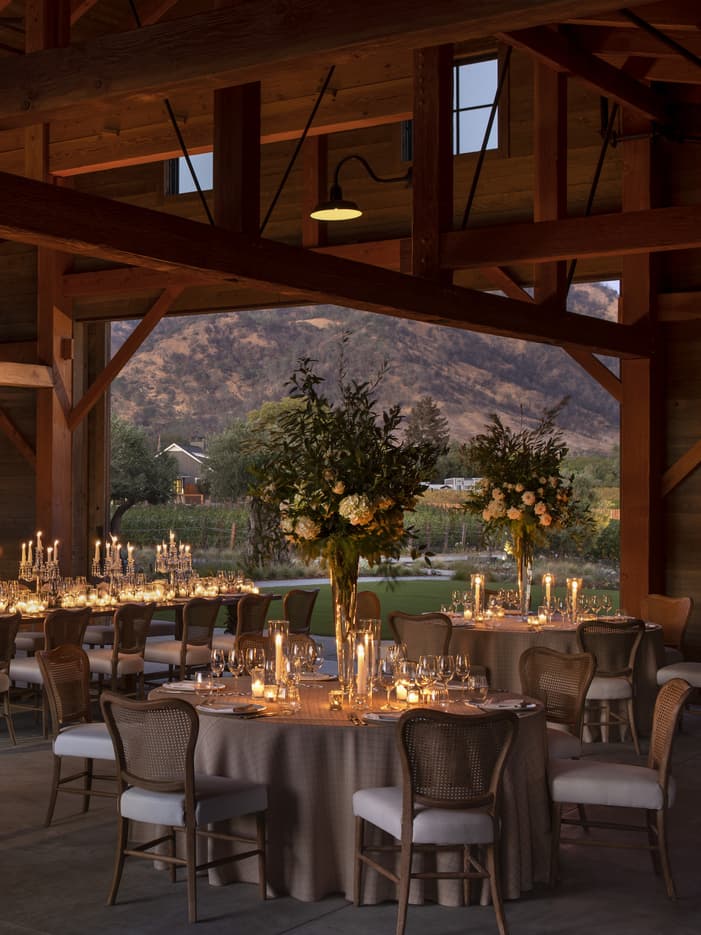 Vineyard Barn and LawnNestled within our Cabernet vineyard, with expansive views of the Palisades, our barn is inspired by the rustic architecture that reflects the valley's agricultural roots.