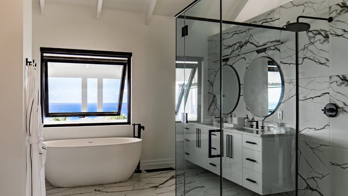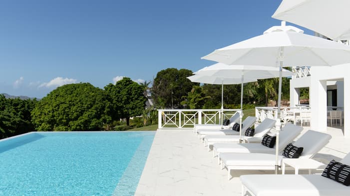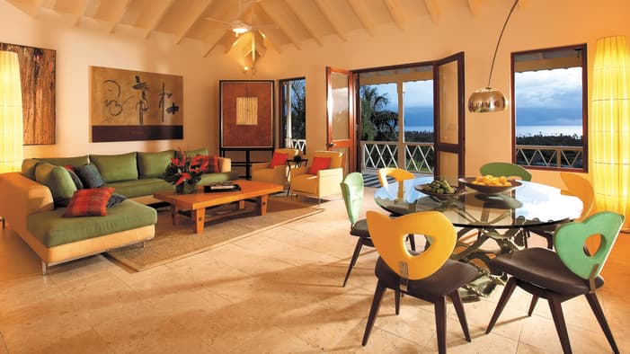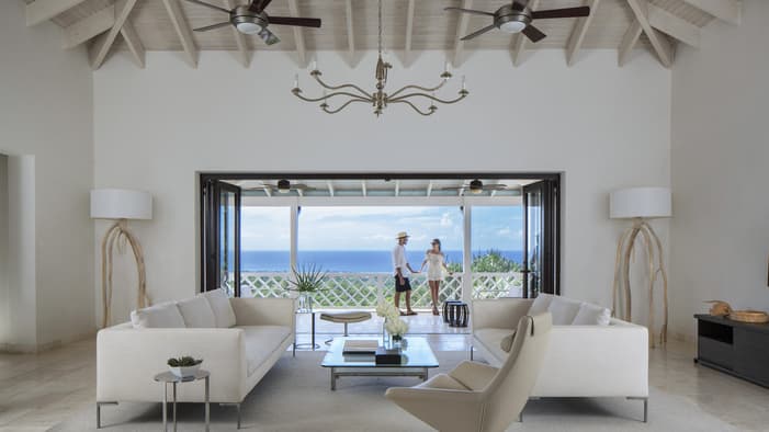 Chic, two-level, sun-filled spaces, these three- and four-bedroom luxury villas in Nevis, West Indies encourage indoor-outdoor living with panoramic views of Nevis Peak and the golf course – just a three-minute walk to the beach.