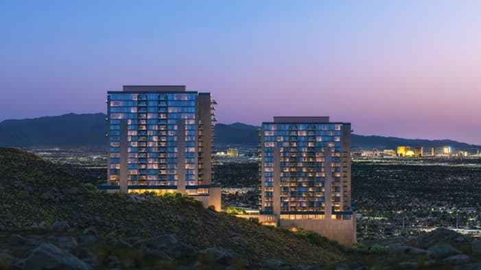 Future homeowners will revel in modern, open-concept living spaces, sweeping views of the Las Vegas strip, and exclusive on-property amenities such as a golf simulator, restaurant, movie room and multiple pools.