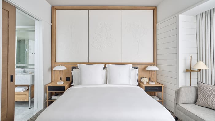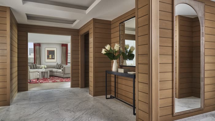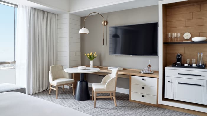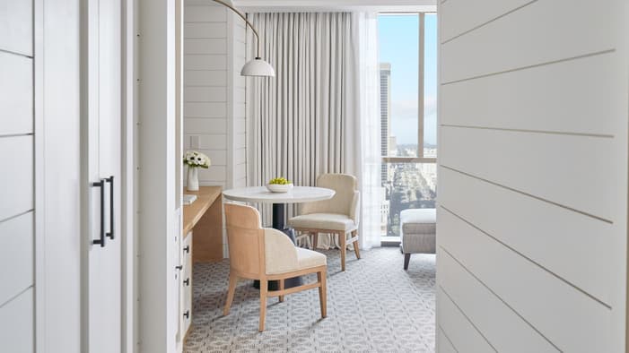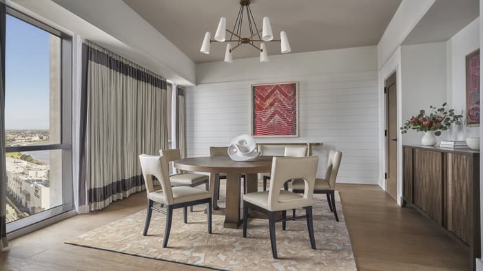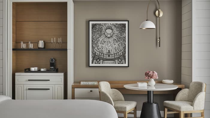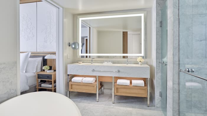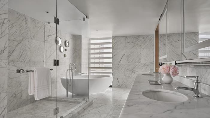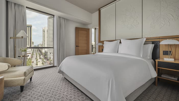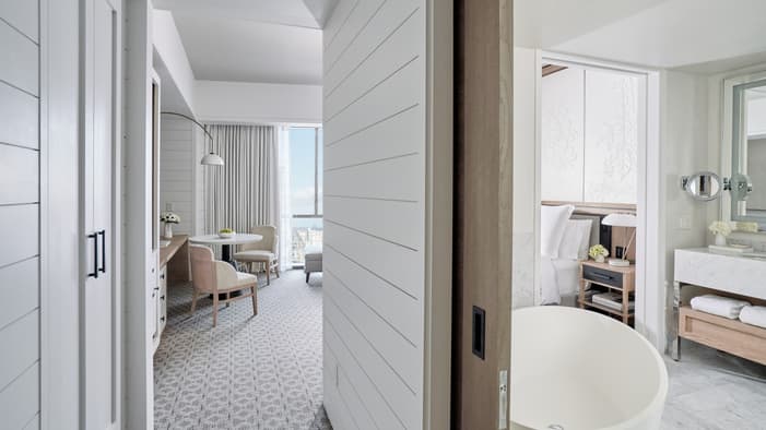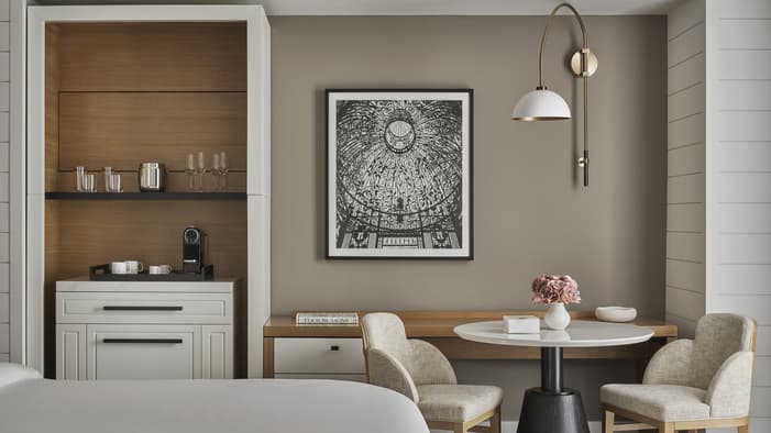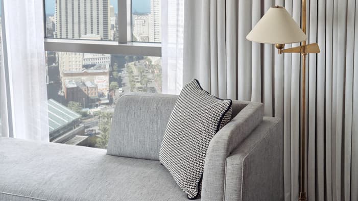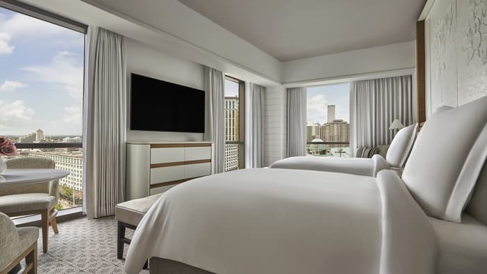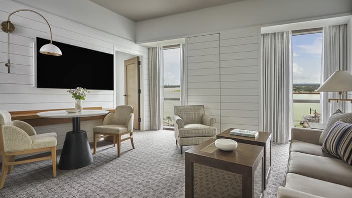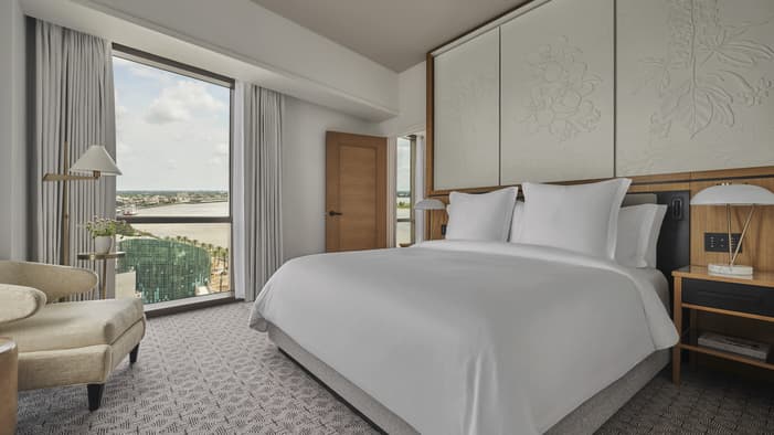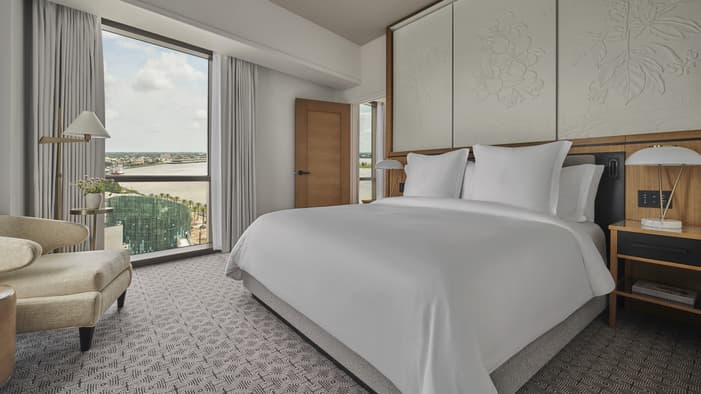 Set on two riverfront acres and framed by lush gardens, Four Seasons Hotel New Orleans features interiors inspired by the property’s botanical backdrop. Throughout the building, you will find references to nature and plants found in a classic New Orleans courtyard. Each guest room features a dramatic focal point just above the bed: a large plaster wall relief depicting magnolia flowers. The interiors’ fresh bright-white palette is layered with local references, including white shiplap walls and soft-washed white oak accents. Bathrooms are clad in white Carrara marble, while bedroom floors feature Wilton woven carpet patterned after the tower’s unique footprint. Furniture reflects the mid-century modern spirit of the tower itself, and all rooms and suites feature special local artwork. Customized lighting is designed to transition naturally from day to night – always setting the perfect ambience for your Four Seasons stay.