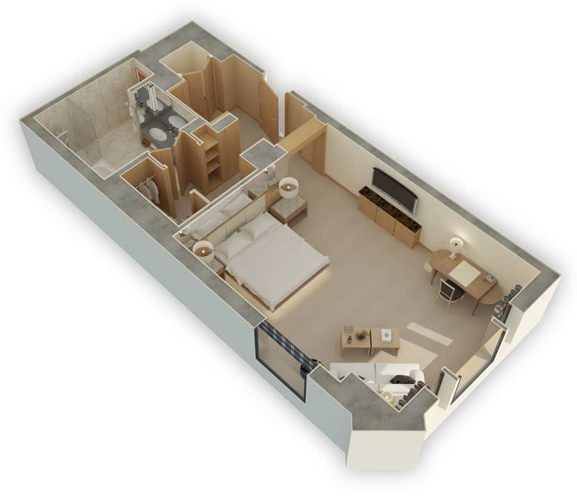 Residential custom furnishings such as a handmade king-sized lighted pedestal bed, a custom made oversized cerused oak executive desk, Japanese tamo ash furniture and a separate makeup area finished in English Sycamore with custom mirrors and seating
