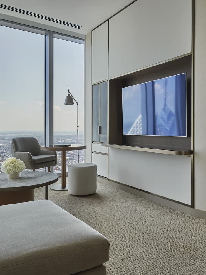 Like a home away from home, this spacious one-bedroom suite invites you to entertain in the stylish living area with views of downtown high-rises, City Hall and the Delaware River. The bedroom features a walk-in closet and a dramatic bathroom with a freestanding oval tub and extra-large shower.
