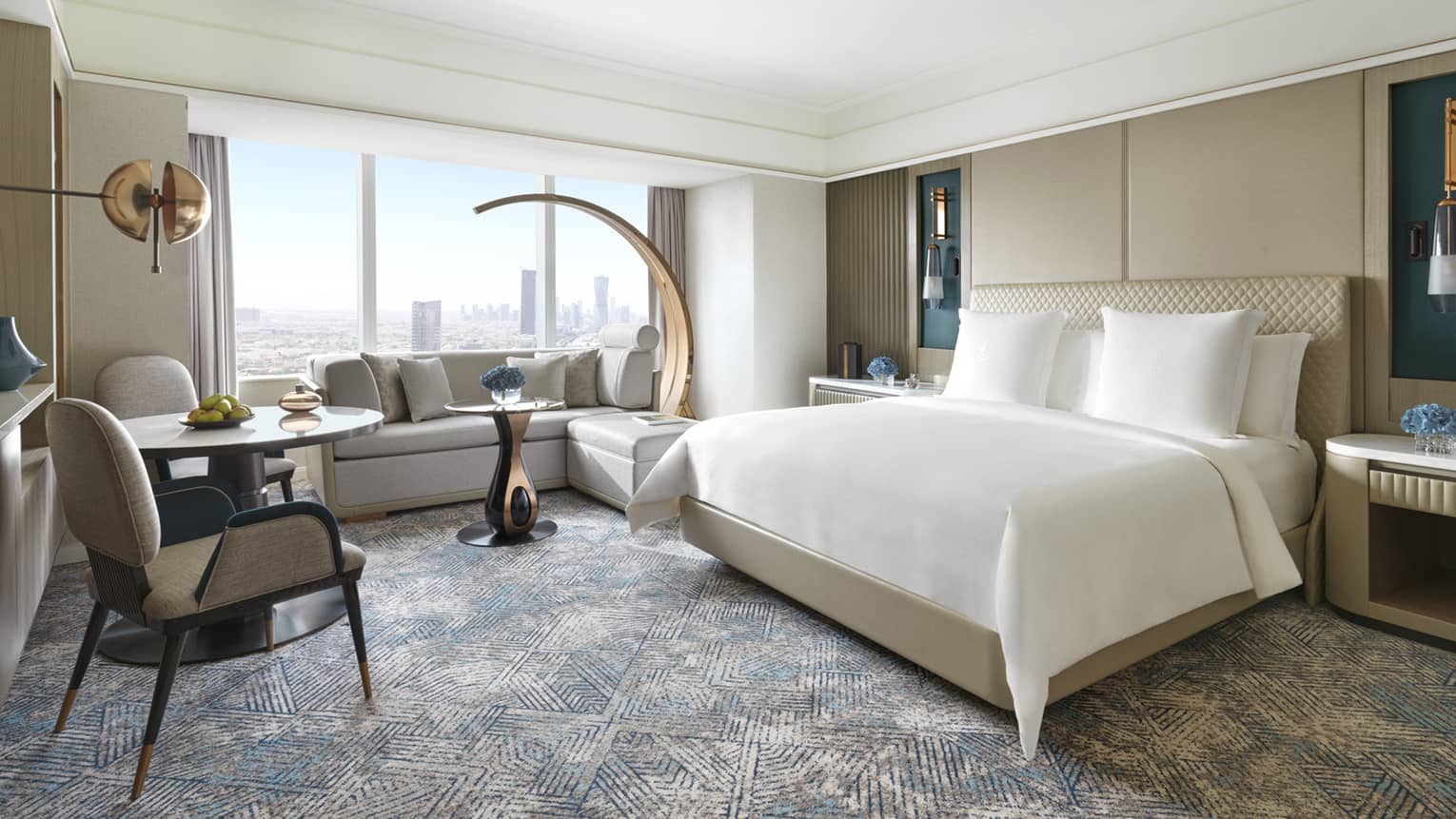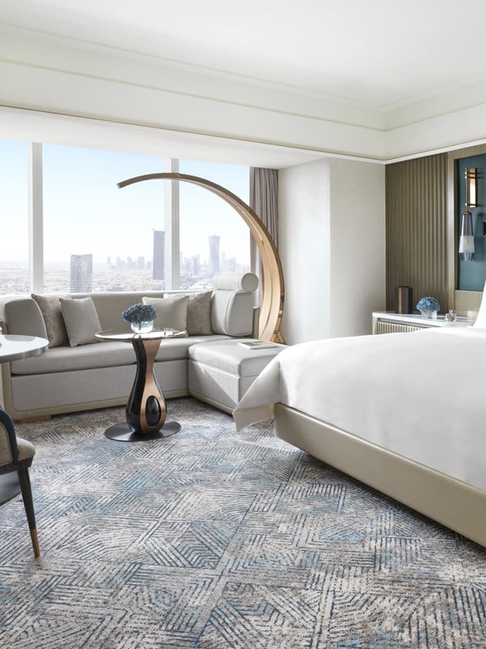 There’s more than enough space for work and relaxation in these guest rooms, whose large windows offer views of the Kingdom’s capital.
