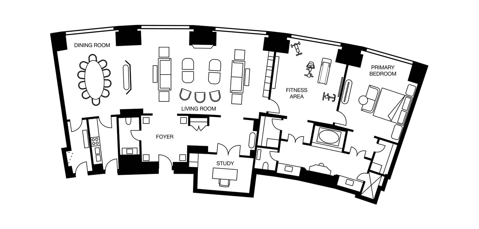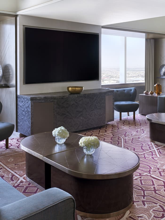 Panoramic views of Riyadh and its surroundings lend a unique sense of exclusivity to this versatile suite, which features an elegant dining room, pantry, living room and executive study.