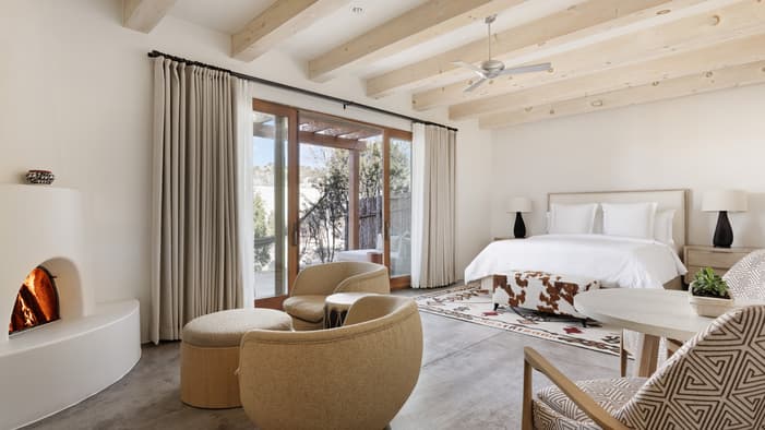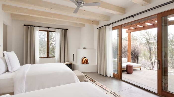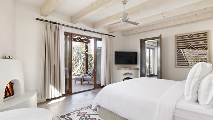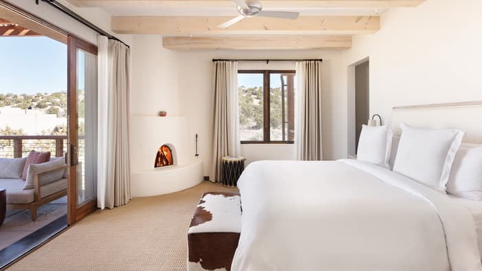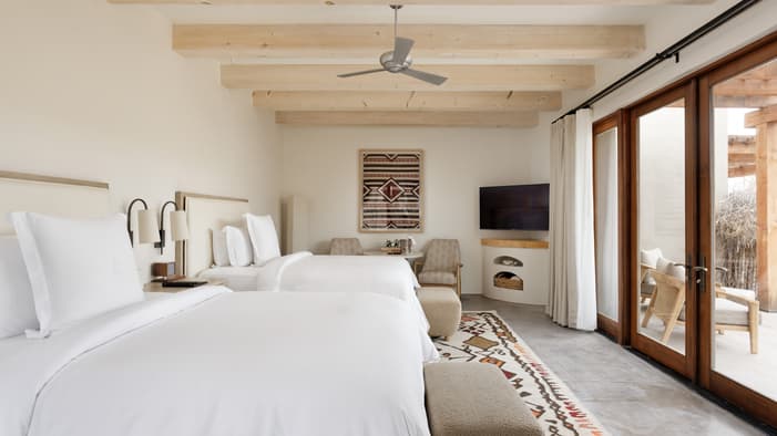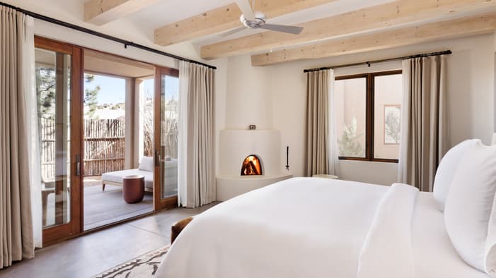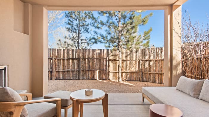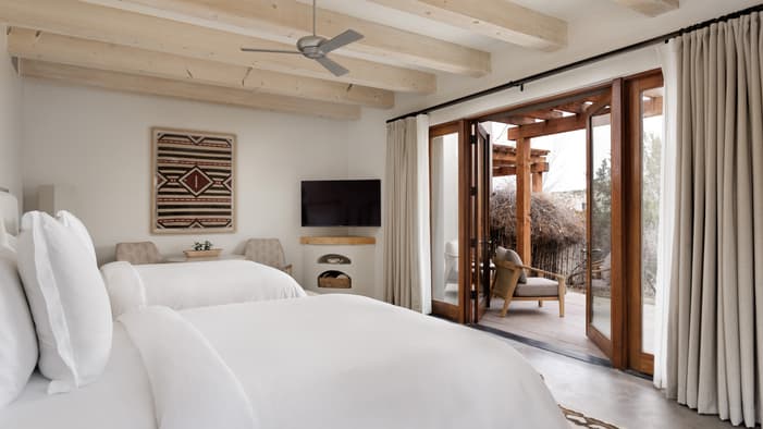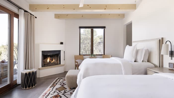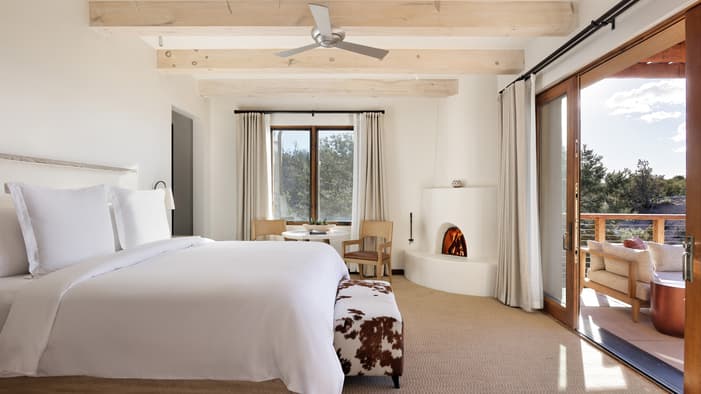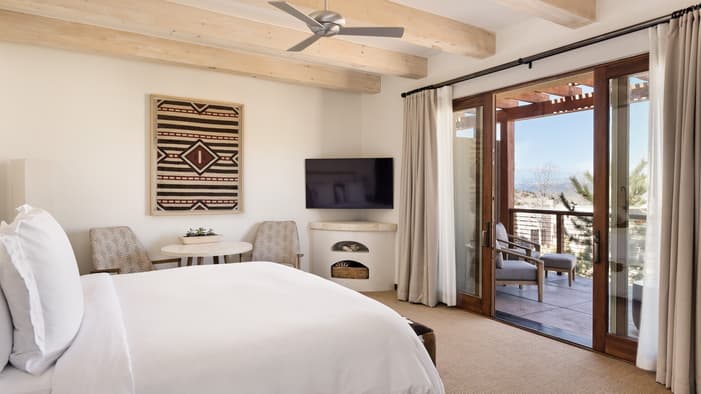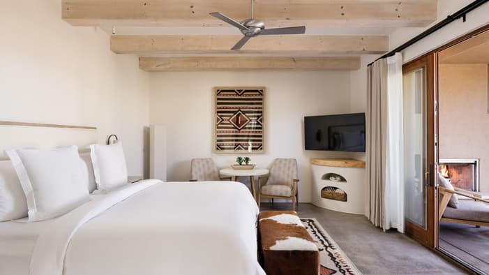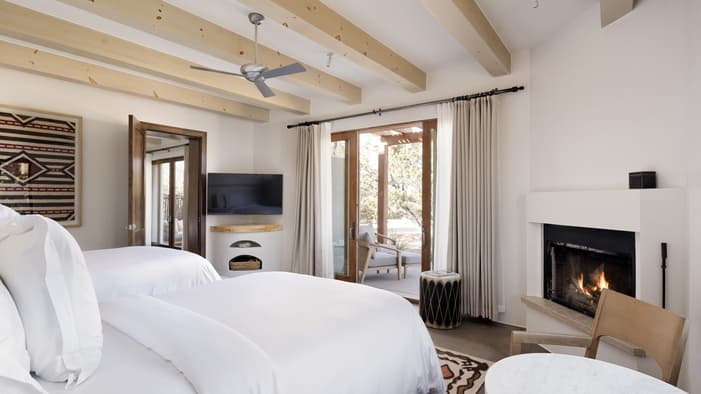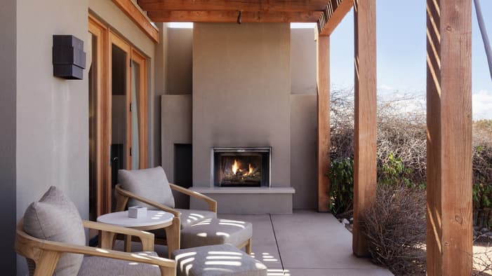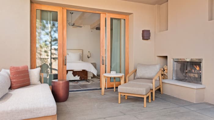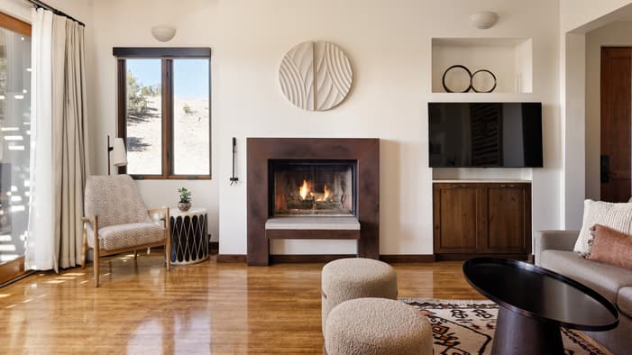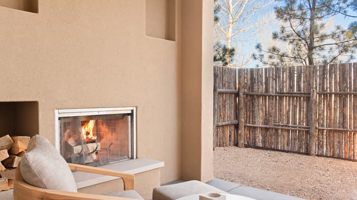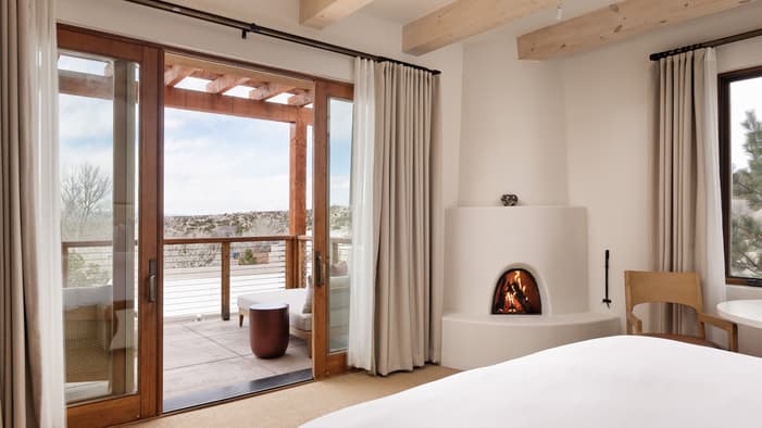 Each casita features a traditional New Mexico, wood-burning kiva fireplace with locally sourced piñon firewood, as well as a private outdoor patio or balcony, to take in the stunning desert sunrises and sunsets.