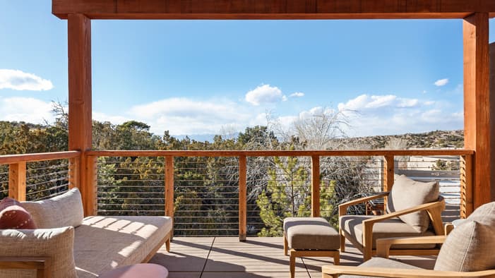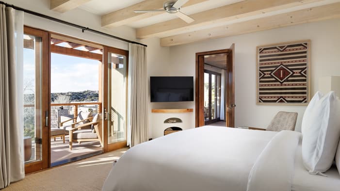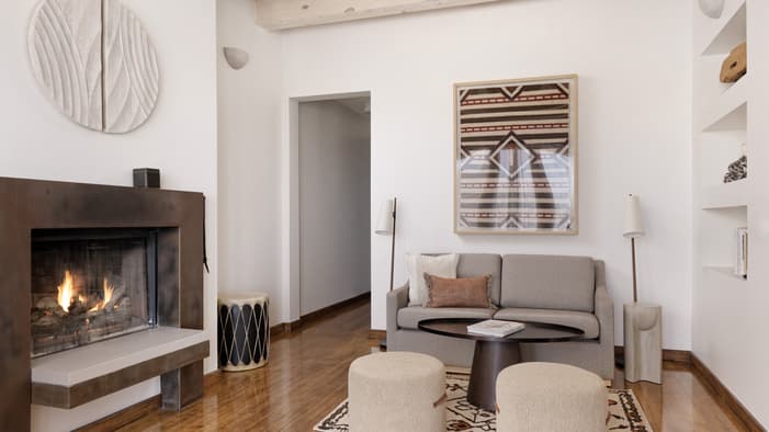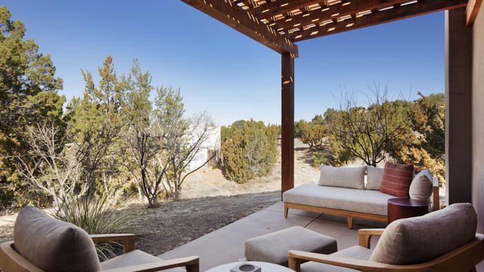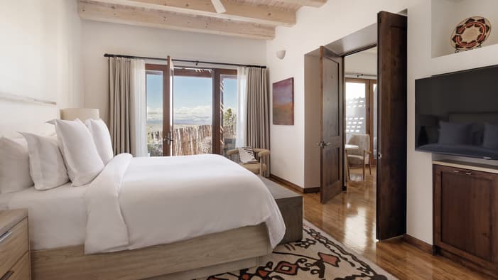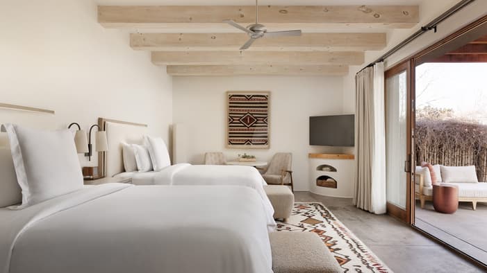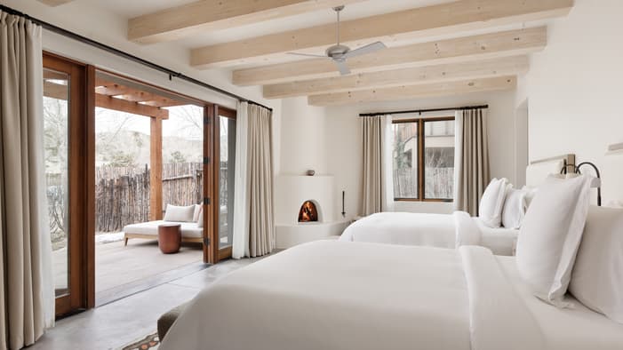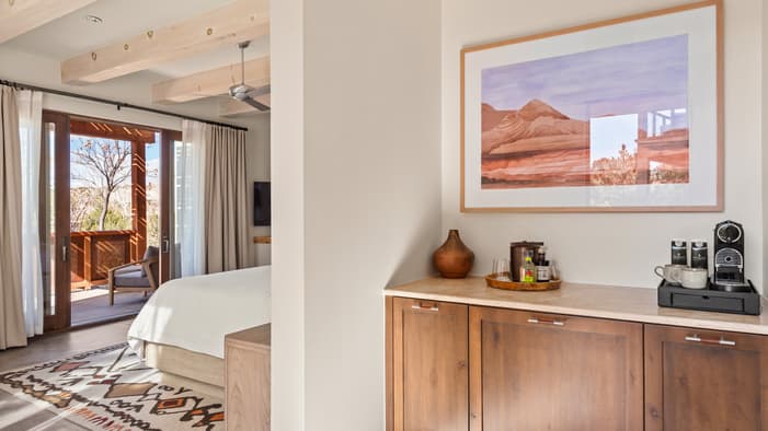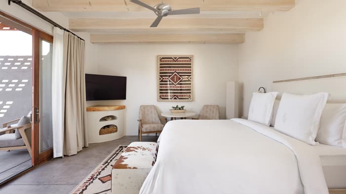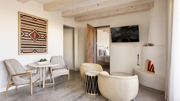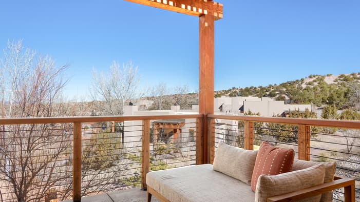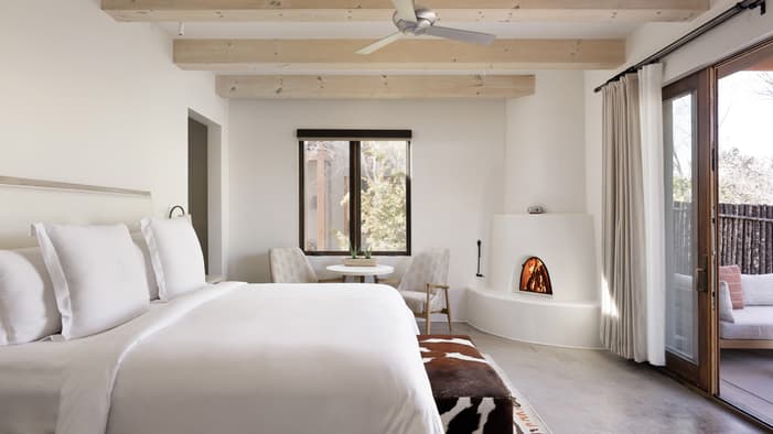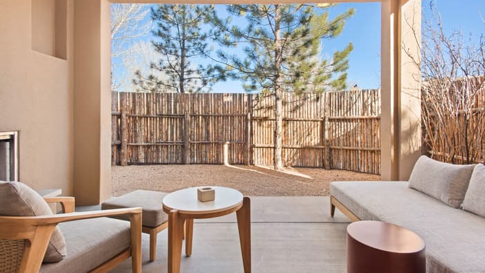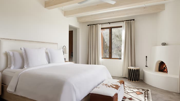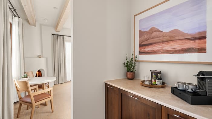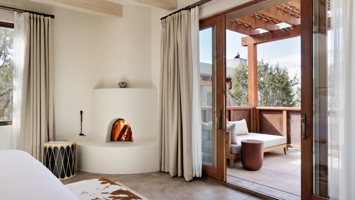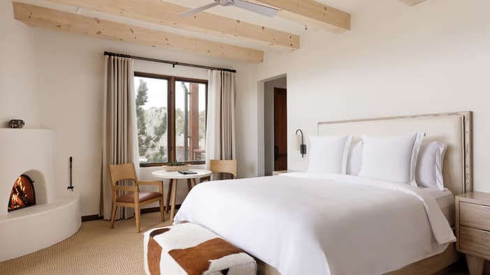 Each casita features a traditional New Mexico, wood-burning kiva fireplace with locally sourced piñon firewood, as well as a private outdoor patio or balcony, to take in the stunning desert sunrises and sunsets.