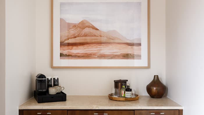 Original artwork, beamed ceilings and simple-yet-bold furnishings reflect our unique desert home.