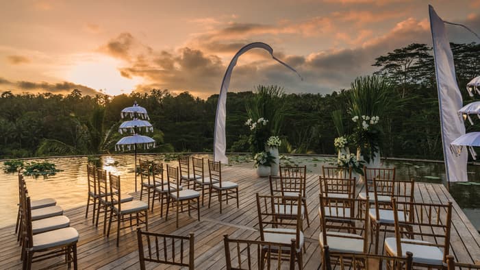 Idyllic Jungle VenuesMake a breathtaking entrance into our infinity-edge Rooftop Lotus Pond venue, surrounded by fragrant flowers. Or host an intimate gathering of canapés, Champagne cocktails and a traditional Balinese performance at Jati Bar and Ayung Terrace. Our secluded indoor-outdoor venues give you a variety of choices for your big day.