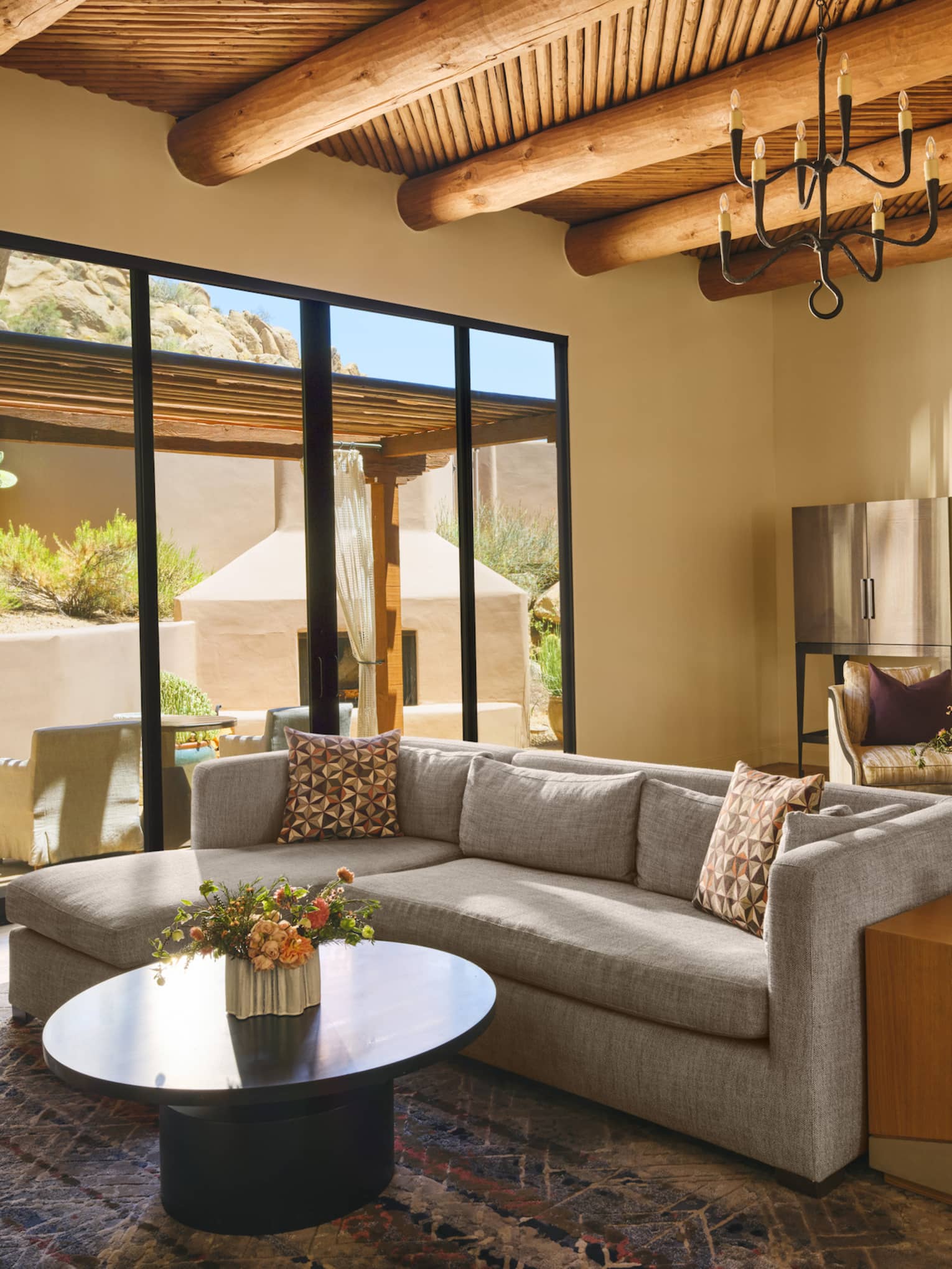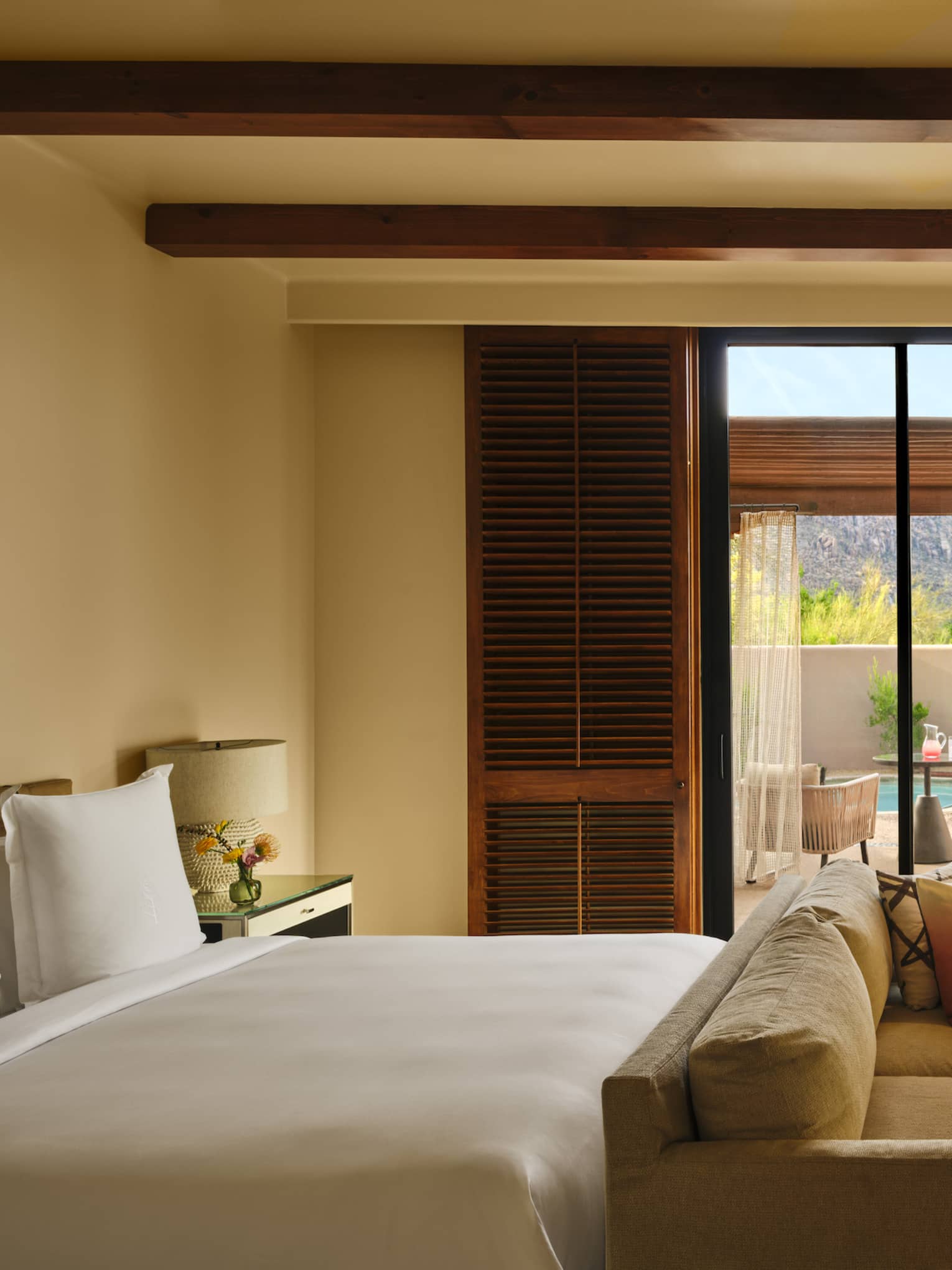 Designed for romance, this private suite offers the warmth of indoor and outdoor fireplaces and the luxury of your own secluded pool. Enjoy the comforts of a well-appointed residence, including a newly renovated bathroom with a deep soaking tub, spacious indoor shower and a serene outdoor garden shower – perfect for a quiet moment under the desert sky.