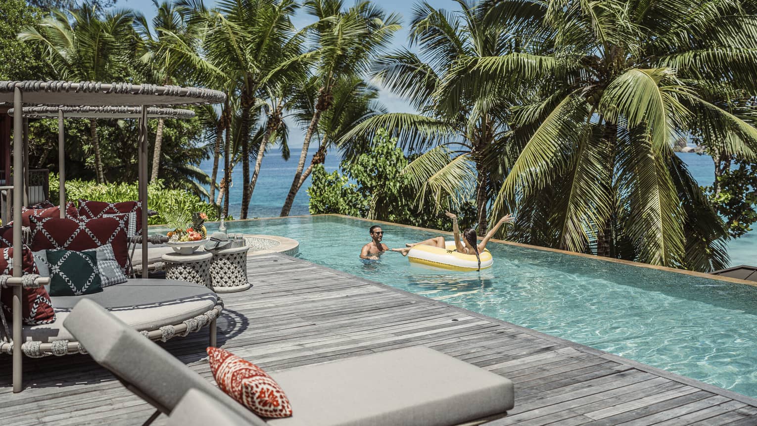 One of only two suites with direct private access to the beach, the Three-Bedroom Royal Suite is comprised of three pavilions with dining and lounging areas. It also offers a private gym, a separate study and den, an infinity-edge pool and a jetted tub overlooking Petite Anse beach.