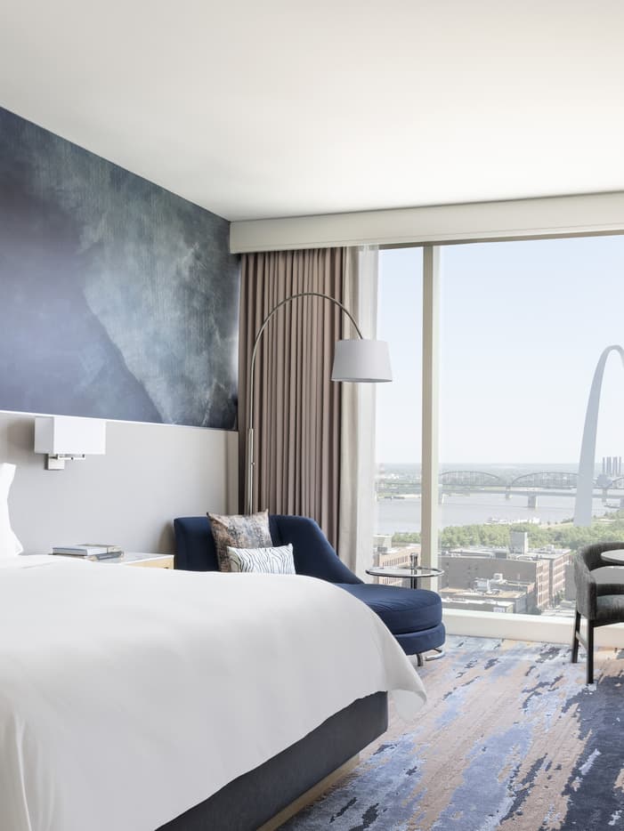 A wall of windows lets you wake up to inspiring views of the Gateway Arch in these bright and airy rooms.