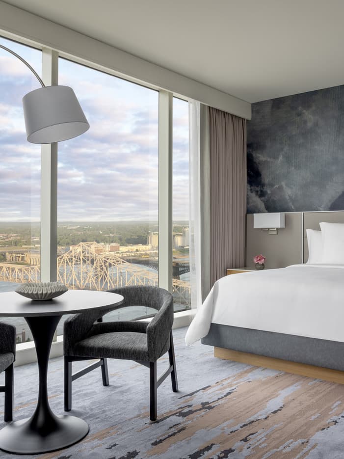 These spacious rooms look out onto the Stan Musial Bridge, creating a cozy place to watch the sun set over the Mississippi River.