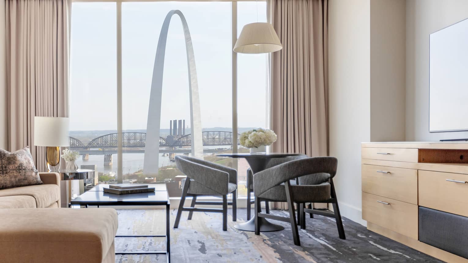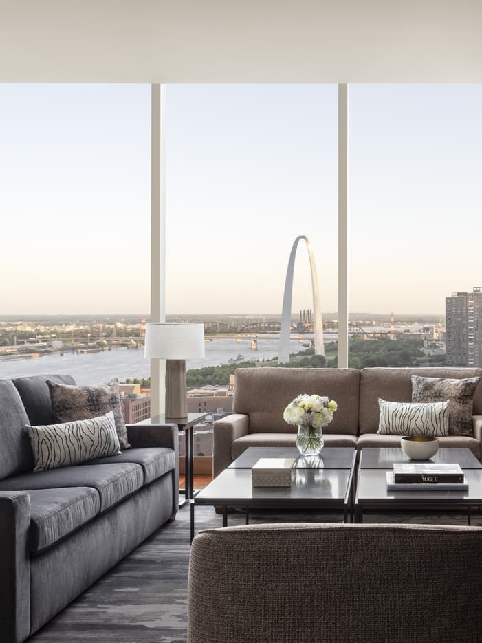 Unlike any other suite, the Presidential Suite offers the ultimate St. Louis experience with custom-designed furnishings to match the grandeur of its sweeping views from its perch on the Hotel’s top floor. With a spacious primary bedroom and adjoining marble bath, the suite also offers an expansive living and dining area, media room, study, kitchen and powder room.