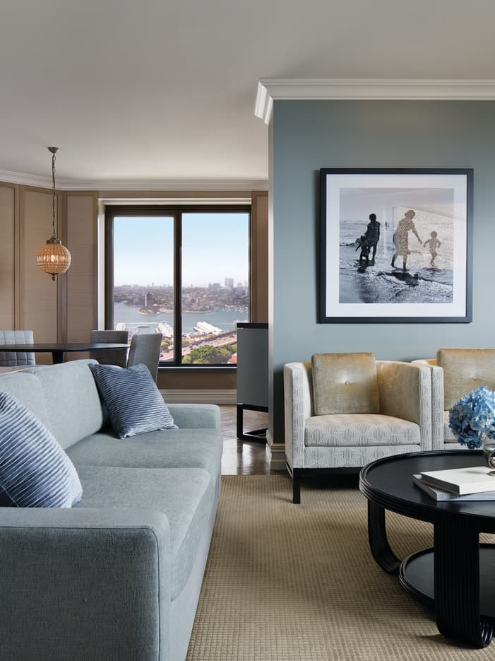 A favourite of newlyweds, dignitaries and executives looking for a bit of glamour, this top-floor suite is a versatile, well-appointed haven for relaxation and entertaining, with its lounge area, private bar, dining table and oversized soaking tub overlooking the Sydney Opera House.
