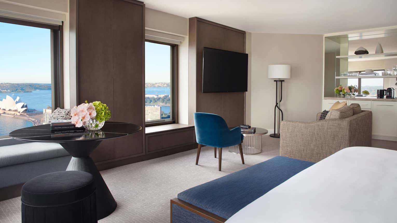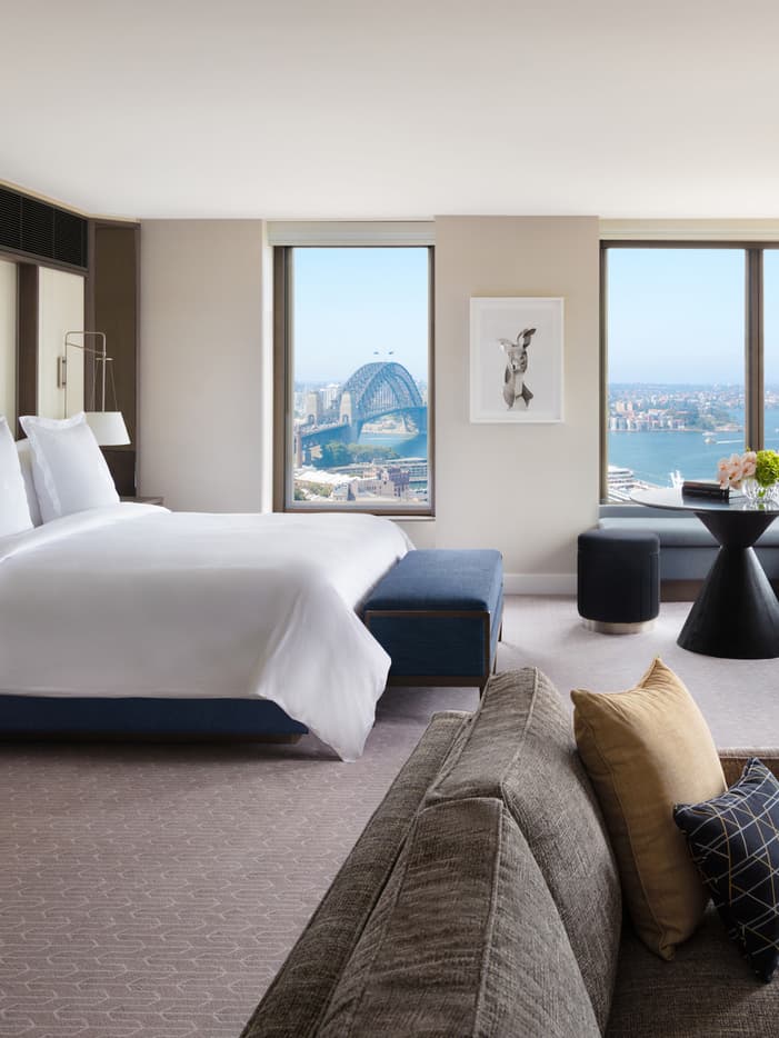 Soaring above Sydney Harbour is our spacious, open-plan Studio Club Suite, offering sweeping views of Sydney’s Harbour Bridge and Opera House. Bathed in natural light, this hotel suite provides an elegant retreat, where you can unwind on the lounge, watch sailboats glide by and take in Sydney’s most iconic skyline.