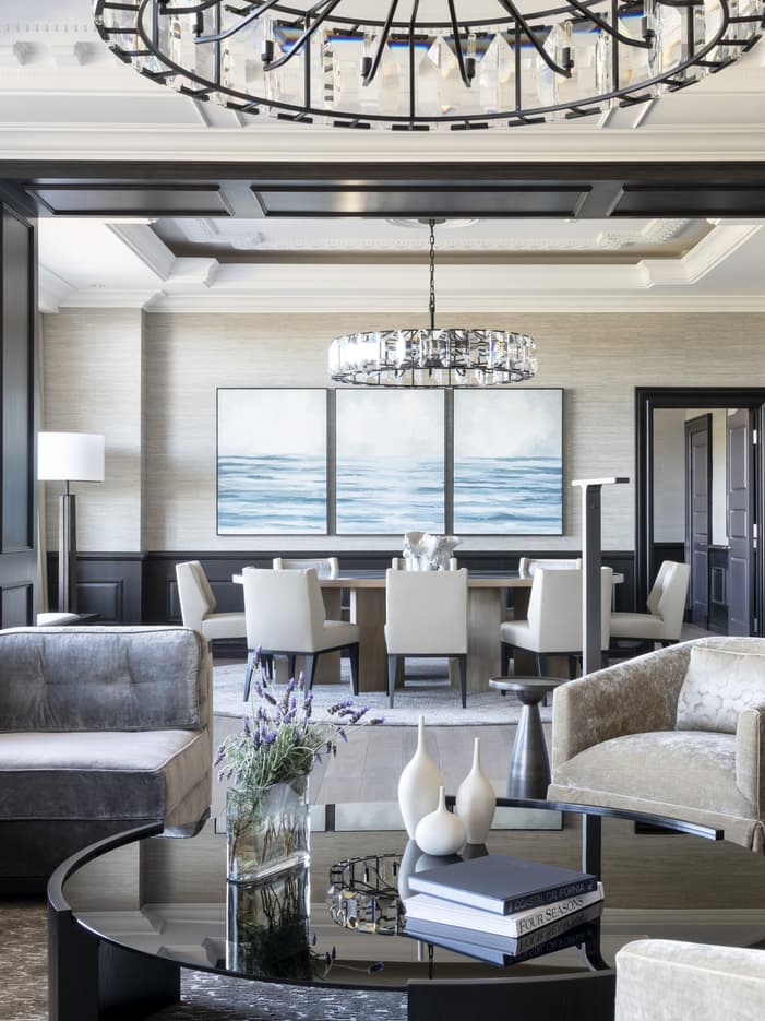 Grand foyer with an inland floor of exotic woods and a dining area for eight with kitchen