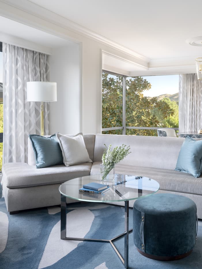 The California sun warms every aspect of this family-friendly suite, while floor-to-ceiling windows feature views of a pristine waterfall and the Santa Monica Mountains.
