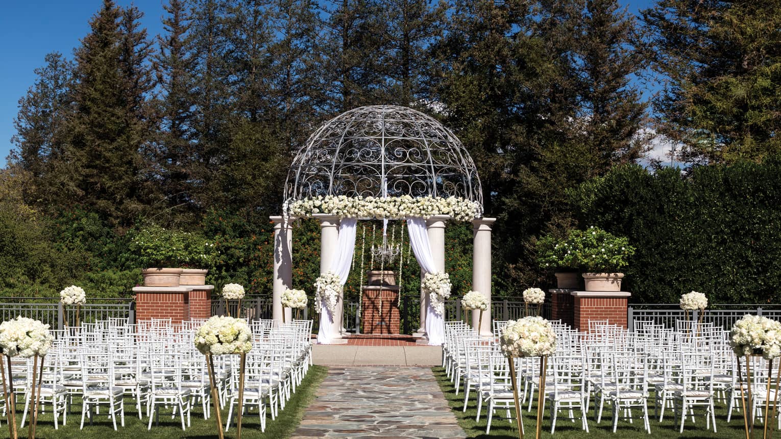 This perfectly manicured lawn, surrounded by lush landscaped gardens with a gazebo at one end, offers an enchanting outdoor venue ideal for an al fresco event or elegant tented function. The entire space includes the covered walkway, lawn and trellis area.